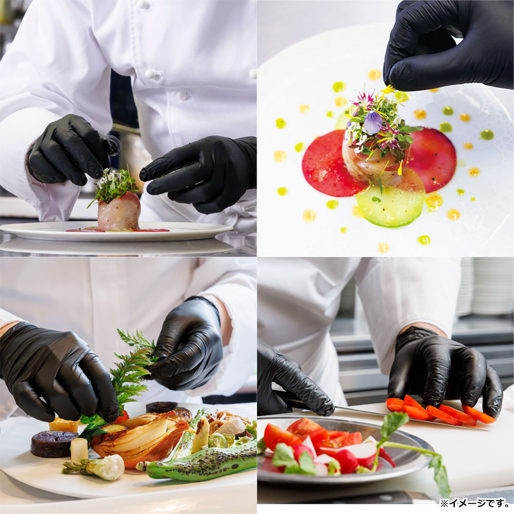 | 素材 | 【仕様】 粉なし・左右兼用タイプ 【材質】 ニトリルゴム 包装材:紙 【サイズ】 ★共通 ・全長:約240mm以上 ・指先厚さ:約0.05mm以上 ・掌部厚さ:約0.05mm以上 ★掌部幅 ・Sサイズ:80±10mm ・Mサイズ:95±10mm ・Lサイズ:110±10mm 【色】 Noir |