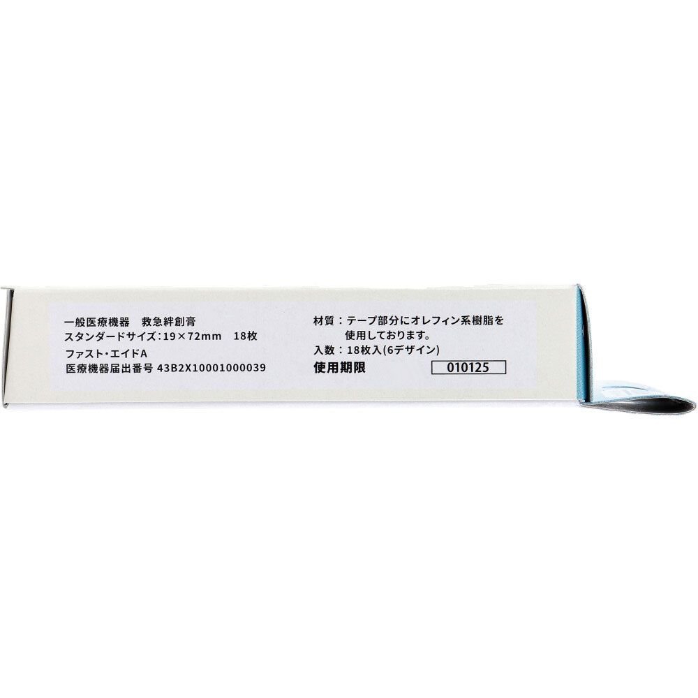| 素材 | 【一般医療機器】 救急絆創膏 医療機器届出番号:43B2X10001000039 販売名:ファスト・エイドA 【材質】 テープ部分にオレフィン系樹脂を使用しております。 【サイズ】 スタンダードサイズ:19×72mm 【使用方法】 ・セパレーターをはがし創傷面にパッド部分をあて、絆創膏部分で固定してください。 |