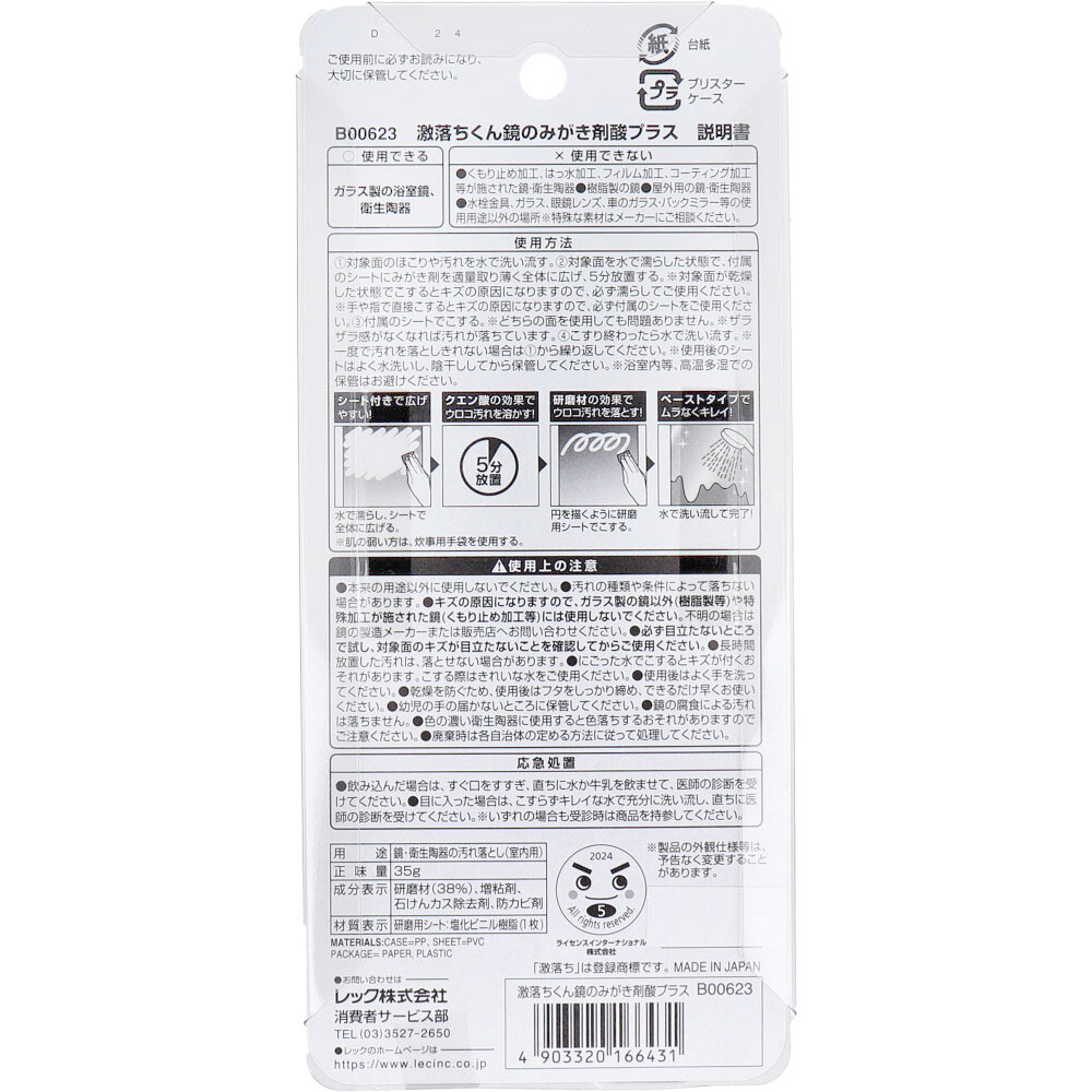 注意事項 | 【使用上の注意】 ・本来の用途以外に使用しないでください。 ・汚れの種類や条件によって落ちない場合があります。 ・キズの原因になりますので、ガラス製の鏡以外(樹脂製等)や特殊加工が施された鏡(くもり止め加工等)には使用しないでください。 ・必ず目立たないところで試し、鏡面のキズが目立たないことを確認してからご使用ください。 ・長時間放置した汚れは、落とせない場合があります。 ・にごった水でこするとキズが付くおそれがあります。こする際はきれいな水をご使用ください。 ・使用後はよく手を洗ってください。 ・乾燥を防ぐため、使用後はフタをしっかり締め、できるだけ早くお使いください。 ・幼児の手の届かないところに保管してください。 ・鏡の腐食による汚れは落ちません。 ・廃棄時は各自治体の定める方法に従って処理してください。 |