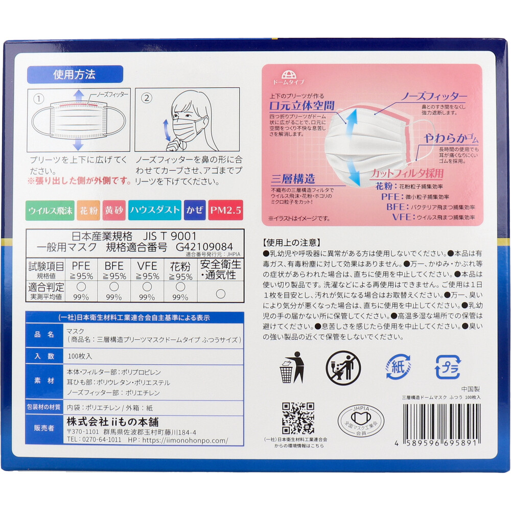 | 素材 | 【品名】 マスク 【素材】 本体・フィルター部:ポリプロピレン 耳ひも部:ポリウレタン、ポリエステル ノーズフィッター部:ポリエチレン 【サイズ】 ふつうサイズ:約9.5cm×17.5cm 【使用方法】 (1)プリーツを上下に広げてください。 ※張り出した側が外側です。 (2)ノーズフィッターを鼻の形に合わせてカーブさせ、アゴまでプリーツを下げてください。 |