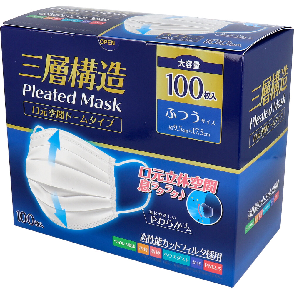 三層構造プリーツマスク 口元空間ドームタイプ ふつうサイズ 大容量 100枚入