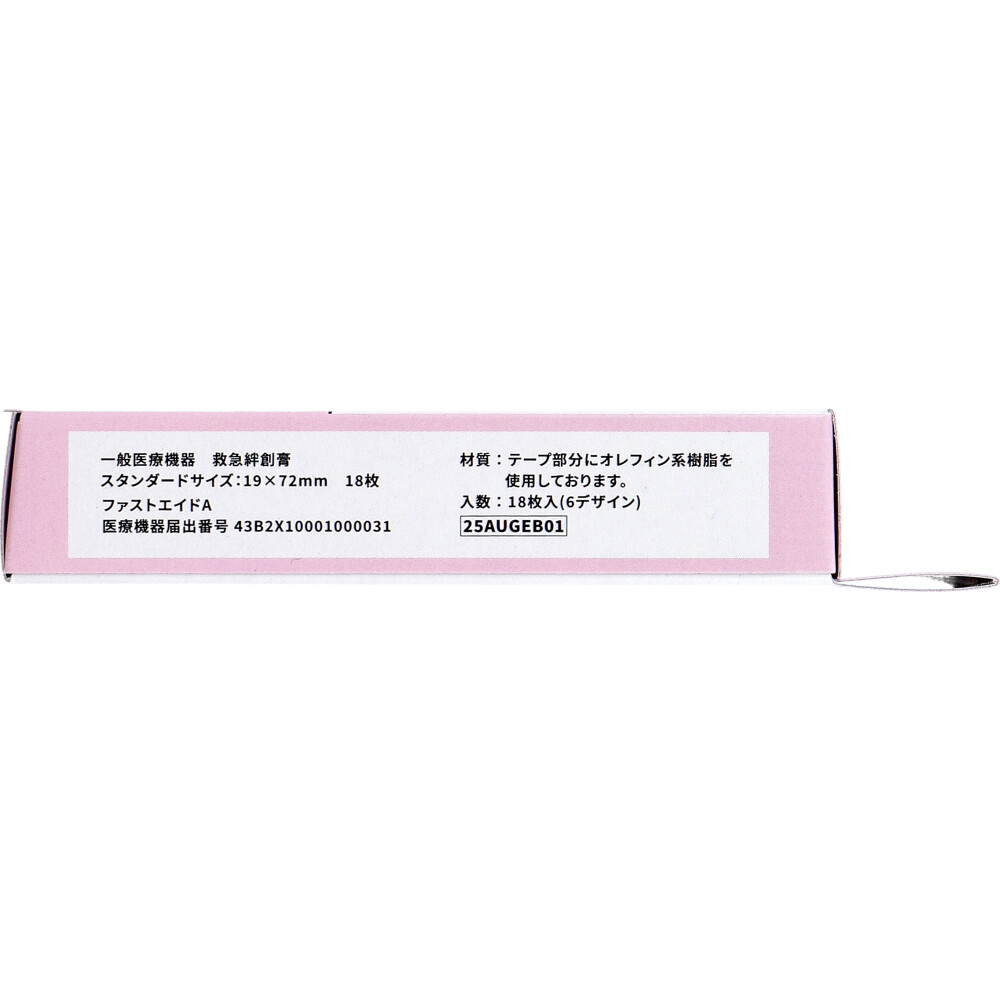 素材 | 【一般医療機器】 救急絆創膏 医療機器届出番号:43B2X10001000031 販売名:ファストエイドA 【材質】 テープ部分にオレフィン系樹脂を使用しております。 【サイズ】 スタンダードサイズ:19×72mm 【使用方法】 セパレーターをはがし創傷面にパッド部分をあて、絆創膏部分で固定してください。 |