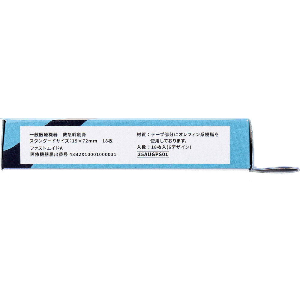 素材 | 【一般医療機器】 救急絆創膏 医療機器届出番号:43B2X10001000031 販売名:ファストエイドA 【材質】 テープ部分にオレフィン系樹脂を使用しております。 【サイズ】 スタンダードサイズ:19×72mm 【使用方法】 セパレーターをはがし創傷面にパッド部分をあて、絆創膏部分で固定してください。 |