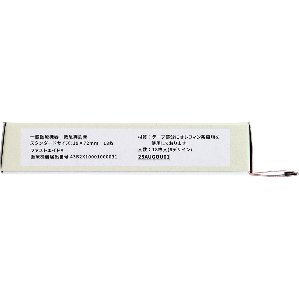 素材 | 【一般医療機器】 救急絆創膏 医療機器届出番号:43B2X10001000031 販売名:ファストエイドA 【材質】 テープ部分にオレフィン系樹脂を使用しております。 【サイズ】 スタンダードサイズ:19×72mm 【使用方法】 セパレーターをはがし創傷面にパッド部分をあて、絆創膏部分で固定してください。 |