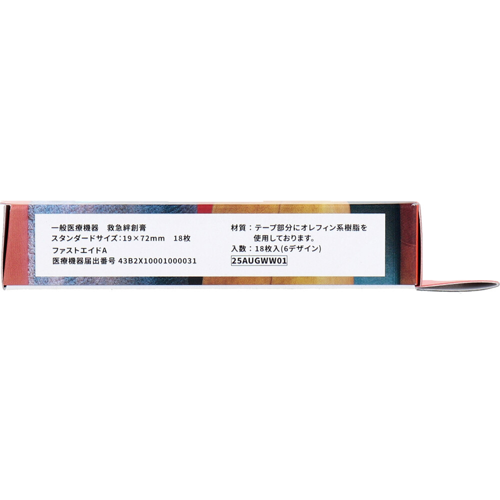 素材 | 【一般医療機器】 救急絆創膏 医療機器届出番号:43B2X10001000031 販売名:ファストエイドA 【材質】 テープ部分にオレフィン系樹脂を使用しております。 【サイズ】 スタンダードサイズ:19×72mm 【使用方法】 セパレーターをはがし創傷面にパッド部分をあて、絆創膏部分で固定してください。 |