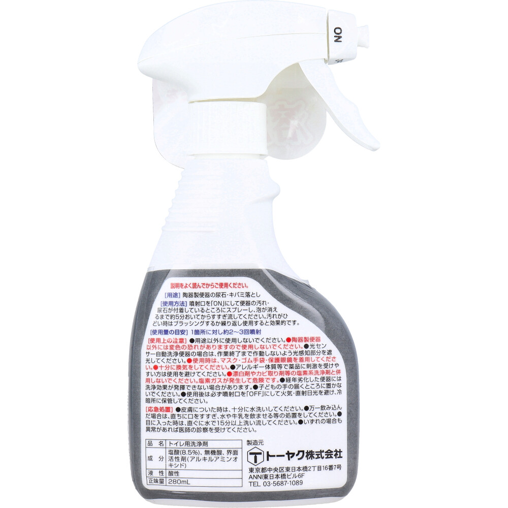 注意事項 | 【使用上の注意】 ・用途以外に使用しないでください。 ・陶器製便器以外には変色の恐れがありますので使用しないでください。 ・光センサー自動洗浄便器の場合は、作業終了まで作動しないよう光感知部分を遮光してください。 ・使用時は、マスク・ゴム手袋・保護用メガネを着用してください。 ・十分に換気をしてください。 ・アレルギー体質等で薬品に刺激を受けやすい方は使用を避けてください。 ・漂白剤やカビ取り剤等の塩素系洗浄剤と併用しないでください。塩素ガスが発生して危険です。 ・経年劣化した便器には洗浄効果が発揮できない場合があります。 ・子どもの手の届くところに置かないでください。 ・使用後は必ず噴射口を「OFF」にして火気・直射日光を避け、冷暗所に保管してください。 【まぜるな危険 酸性タイプ】 ・塩素系の製品と一緒に使う(まぜる)と有害な塩素ガスが出て危険。 |