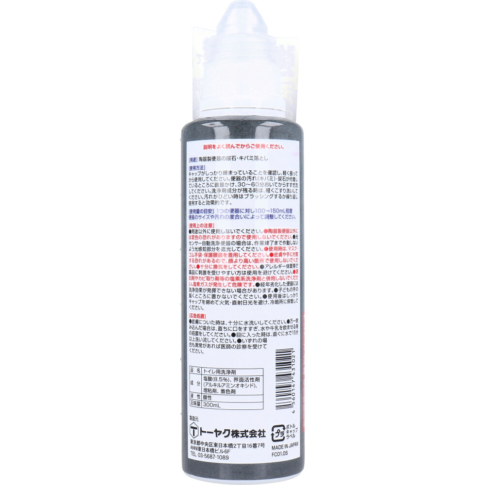 注意事項 | 【使用上の注意】 ・用途以外に使用しないでください。 ・陶器製便器以外には変色の恐れがありますので使用しないでください。 ・光センサー自動洗浄便器の場合は、作業終了まで作動しないよう光感知部分を遮光してください。 ・使用時はマスク・ゴム手袋・保護眼鏡を着用してください。 ・皮膚や手に付着する恐れがあるので、顔より高い箇所で使用しないでください。 ・十分に換気をしてください。 ・アレルギー体質等で薬品に刺激を受けやすい方は使用をさけてください。 ・漂白剤やカビ取り剤等の塩素系洗浄剤と併用しないでください。塩素ガスが発生して危険です。 ・経年劣化した便器には洗浄効果が発揮できない場合があります。 ・子どもの手の届くところに置かないでください。 ・使用後はしっかりキャップを締めて火気・直射日光を避け、冷暗所に保管してください。 【まぜるな危険 酸性タイプ】 ・塩素系の製品と一緒に使う(まぜる)と有害な塩素ガスが出て危険。 |