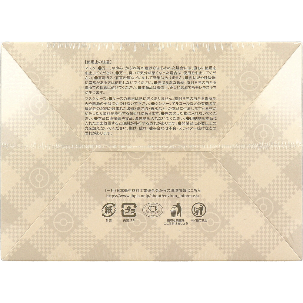注意事項 | 【使用上の注意】 ★マスク ・万一、かゆみ、かぶれ等の症状があらわれた場合には、直ちに使用を中止してください。 ・万一、臭いで気分が悪くなった場合は、使用を中止してください。 ・有毒ガス・有害粉塵などに対して効果はありません。 ・乳幼児や呼吸器に異常がある方は使用しないでください。 ・高温多湿な場所、直射日光の当たる場所での保管は避けてください。 ・本商品は構造上、正しい装着でもモレやスキマが生じます。 ・マスクは感染(侵入)を完全に防ぐものではありません。 ★マスクケース ・ケースの素材は熱に強くありません。直射日光の当たる場所や火や熱源のそばに近づけないで下さい。 ・シンナー、アルコールなどの有機系や揮発性の溶剤が含まれた液体(除光液・香水など)が本品に付着しますと素材が変色したり染料が移行するおそれがあります。 ・先の尖った物は入れないでください。 ・本品に直接薬や食品、液体物を入れないでください。 ・印刷物を本品に入れたまま放置すると印刷が移行する恐れがあります。 ・開閉部に必要以上の力を加えないでください。裂け・破れ・噛み合わせ不良・スライダー抜けなどの恐れがあります。 |