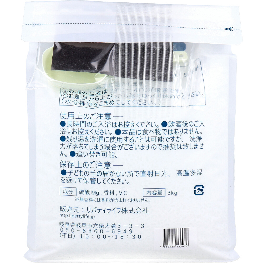 素材 | 【入浴用化粧品】 【成分】 硫酸Mg、香料、V.C 【ご使用方法】 (1)浴槽150Lに対して150gを入れます。(付属の計量スプーンはすりきり一杯30g・5杯が目安です。) (2)よくまぜてお湯に溶かします。 (3)お湯の温度は39度~41度が最適です。 (4)お風呂から上がったら体をゆっくり休めてください。(水分補給をこまめにしてください。) |