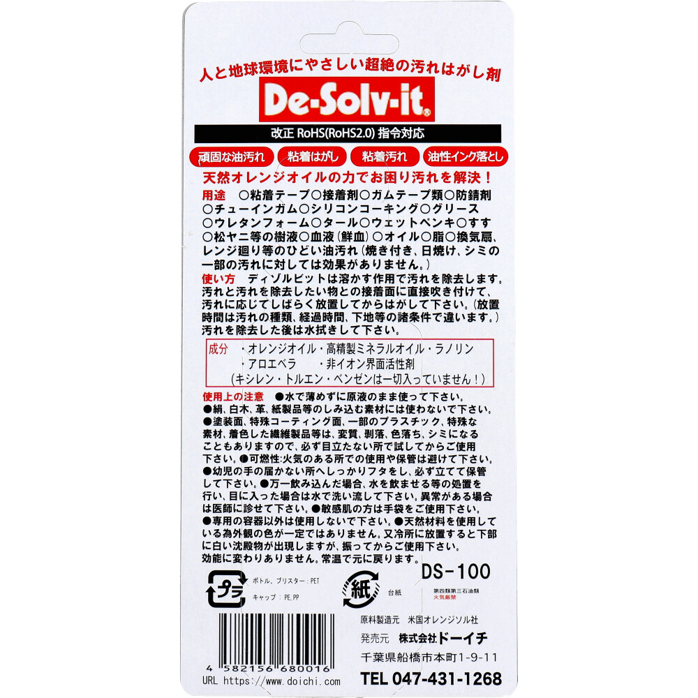 素材 | 【成分】 オレンジオイル、高精製ミネラルオイル、ラノリン、アロエベラ、非イオン界面活性剤(キシレン・トルエン・ベンゼンは一切使っていません!) 【用途】 粘着テープ、接着剤、ガムテープ類、防錆剤、チューインガム、シリコンコーキング、グリース、ウレタンフォーム、タール、ウェットペンキ、すす、松ヤニ等の樹液、血液(鮮血)、オイル、脂、換気扇、レンジ廻り等のひどい油汚れ(焼き付き、日焼け、シミ等の一部の汚れに対しては効果がありません。) 【使い方】 ディゾルビットは溶かす作用で汚れを除去します。 汚れと汚れを除去したい物との接着面に直接吹き付けて、汚れに応じてしばらく放置してからはがして下さい。 (放置時間は汚れの種類 経過時間、下地等の諸条件で違います。) 汚れを除去した後は水拭きして下さい。 |