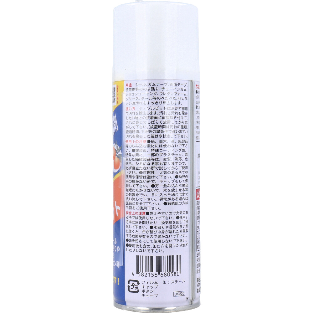 素材 | 【成分】 天然オレンジオイル 【用途】 シール、ガムテープ、 両面テープ、接着剤等ののり残り、チューインガム、シリコンコーキング、ウレタンフォーム、グリース、タール等のべたべた汚れ、ひどい油汚れをすっきり除去します。 【使い方】 ディゾルビットは溶かす作用で汚れを除去します。 汚れと汚れを除去したい物との接着面に直接吹き付けて、汚れに応じてしばらく放置してからはがして下さい。 (放置時間は汚れの種類 経過時間、下地等の諸条件で違います。) 汚れを除去した後は水拭きして下さい。 |