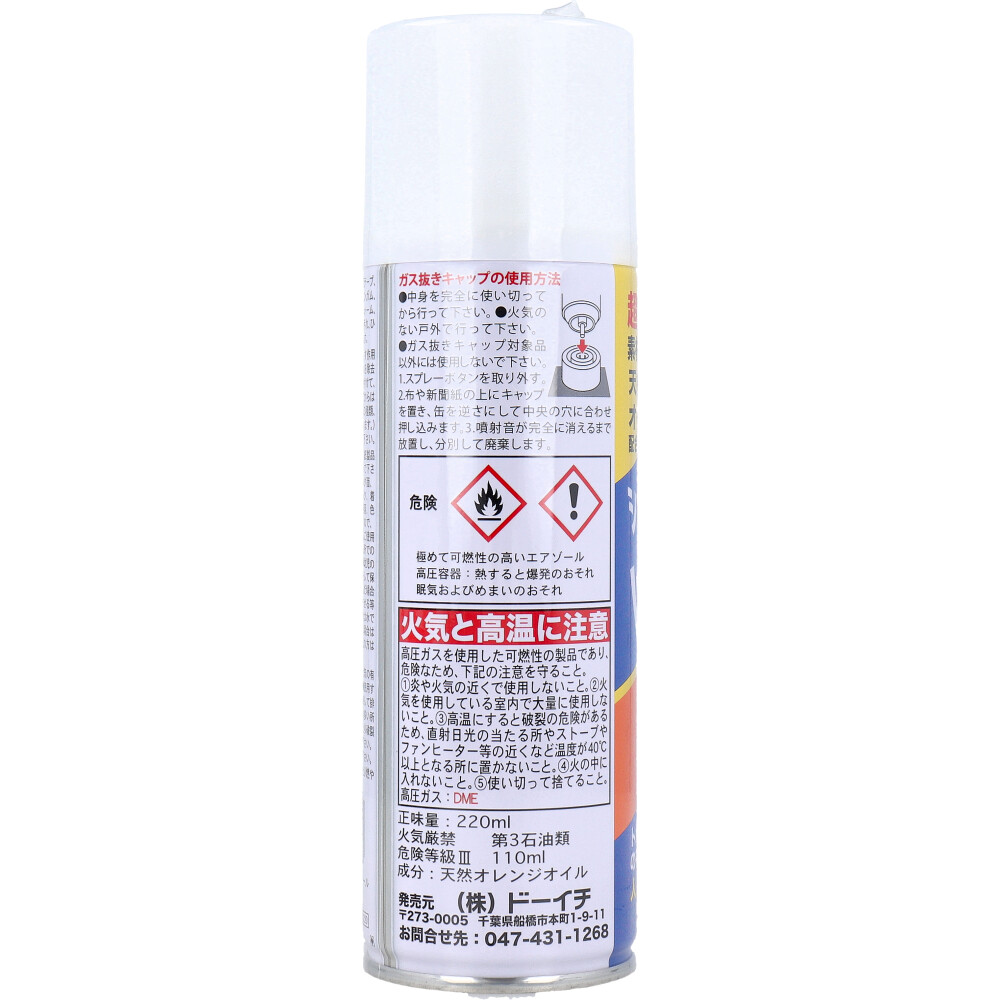 注意事項 | 【使用上の注意】 ・水で薄めずに原液のまま使って下さい。 ・絹、白木、革、紙製品等のしみ込む素材には使わないで下さい。 ・塗装面、 特殊コーティング面、特殊な素材、一部のプラスチック、着色した繊維製品等は、変質、剥落、色落ち、シミになることもありますので、必ず目立たない所で試してからご使用下さい。 ・可燃性:火気のある所での使用や保管は避けて下さい。 ・幼児の手の届かない所で、キャップをして保管して下さい。 ・万一飲み込んだ場合、無理に吐かせないで、水を飲ませる等の処置を行い、目に入った場合は水で洗い流して下さい。異常がある場合は医師に診せて下さい。 ・敏感肌の方は手袋をご使用下さい。 ★安全上の注意 ・燃えやすいので火気の有る所では使用しないで下さい。 ・使用する時は窓を開けたり、換気扇を回して排気して下さい。 ・水回りや湿気の多い所に置くと、缶が錆び中身が漏れたり破裂する危険が有るので置かないで下さい。 ・缶を逆さにして使用しないで下さい。 ・使用後も含め、缶に穴を開けたり燃やありやしたりしないで下さい。 |