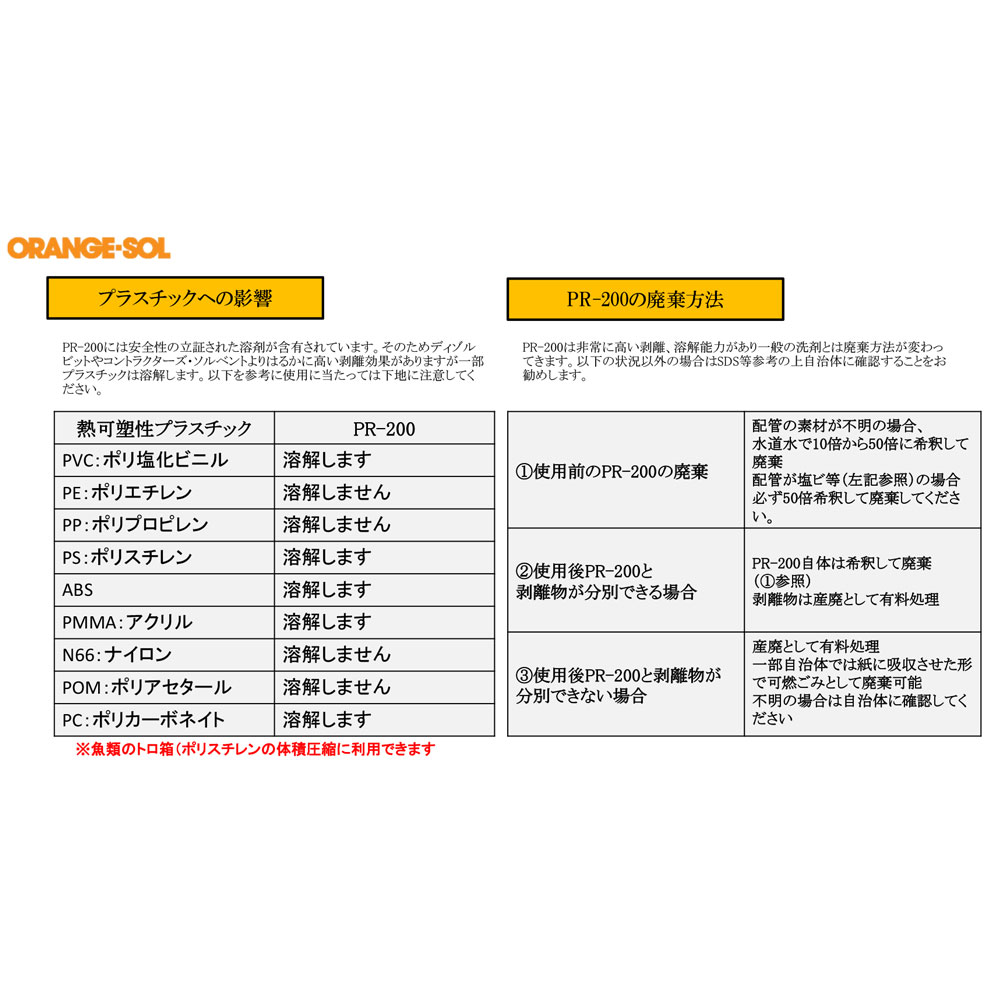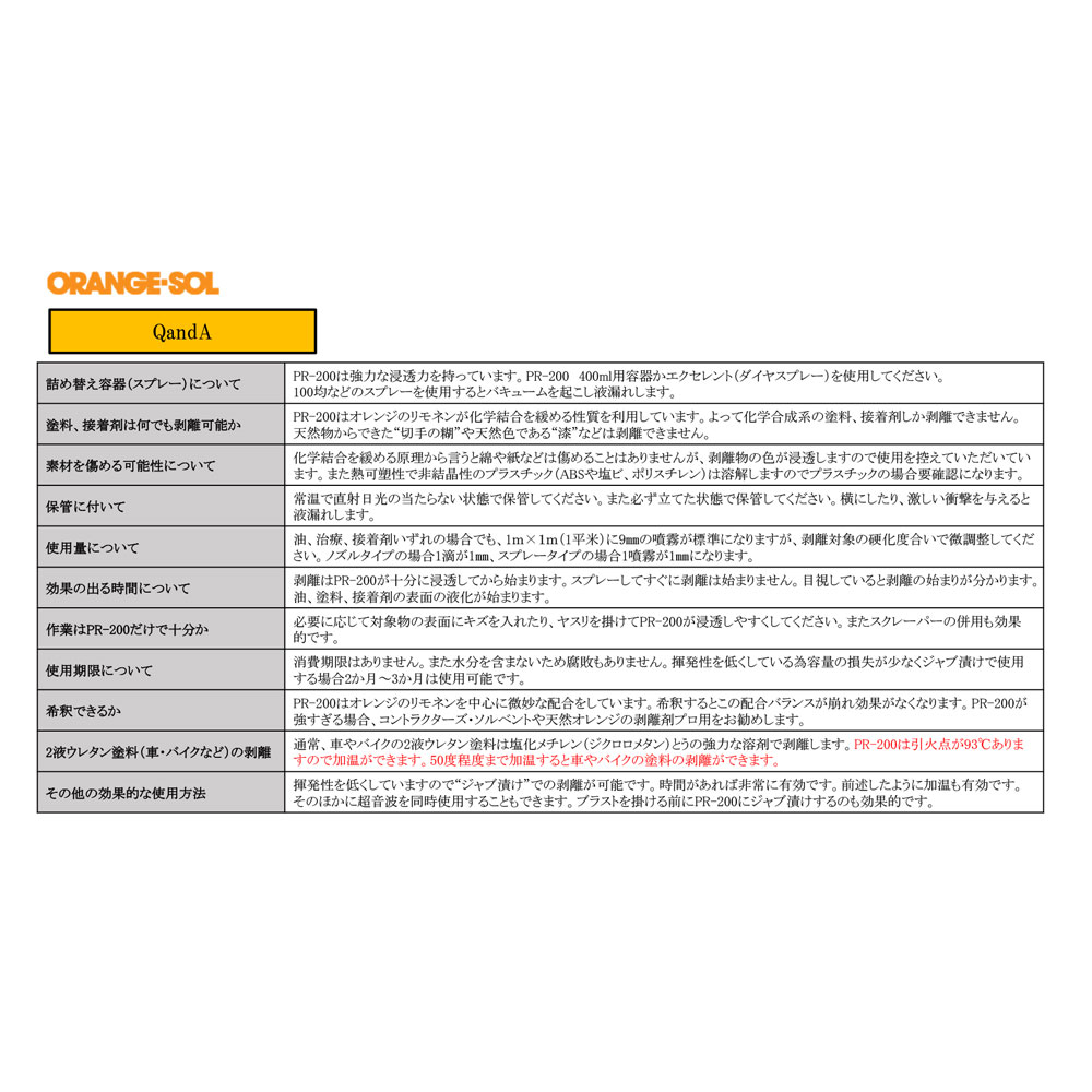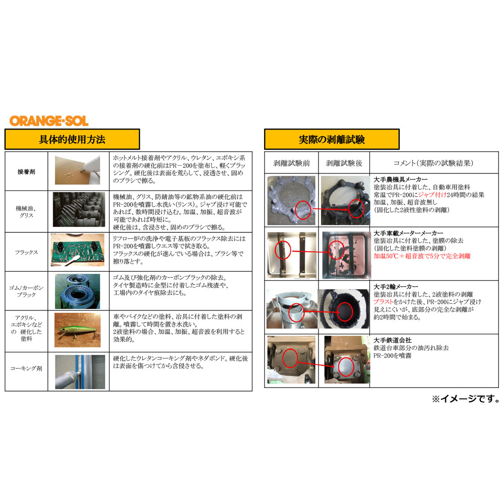 素材 | 【用途】 ガラス、金属、セラミックス、コンクリート等についた頑固な接着剤やペンキの汚れを落とします。 ※下地を傷つけることがありますので、あらかじめ目立たない所で試してからご使用下さい。 【成分】 オレンジオイル 【使用法】 ・薄めず原液で使います。 ・厚く固まった接着剤やペンキはナイフまたはサンドペーパー等で削ってから液をつけると浸透しやすく能率的です。 ・使用後は水で洗い流すか、水拭きをして下さい。 |