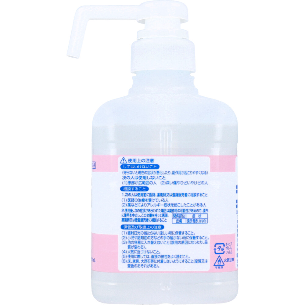 | 注意事項 | 【用法及び用量に関連する注意】 ・用法・用量を厳守すること。 ・本剤は希釈せず、原液のまま使用すること。 ・小児に使用させる場合には、保護者の指導監督のもとに使用させること。 ・目に入らないように注意すること。万一、目に入った場合には、すぐに水又はぬるま湯で洗うこと。なお、症状が重い場合には、眼科医の診療を受けること。 ・外用にのみ使用し、アルコールが完全に揮発するまで擦り込むこと。 ・血液や汚物等が付着している場合には、石けんで洗浄後、水分を除去してから使用すること。 【使用上の注意】 ★してはいけないこと(守らないと現在の症状が悪化したり、副作用が起こりやすくなる) ・次の人は使用しないこと。 (1)患部が広範囲の人 (2)深い傷やひどいやけどの人 ★相談すること ・次の人は使用前に医師、薬剤師又は登録販売者に相談すること。 (1)医師の治療を受けている人 (2)薬などによりアレルギー症状を起こしたことがある人 ・使用後、次の症状があらわれた場合は副作用の可能性があるので、直ちに使用を中止し、この文書を持って医師、薬剤師又は登録販売者に相談すること。 関係部位:皮膚/症状:発疹、発赤、かゆみ ★保管及び取扱上の注意 ・直射日光の当たらない涼しい所に保管すること。 ・小児や認知症の方などの手の届かない所に保管すること。 ・他の容器に入れ替えないこと(誤用の原因になったり、品質が変わる)。 ・火気に近づけないこと。 ・使用に際しては、直接の被包をよく読むこと。 ・床、家具、大理石等に付着しないようにすること(変質又は変色のおそれがある)。 |