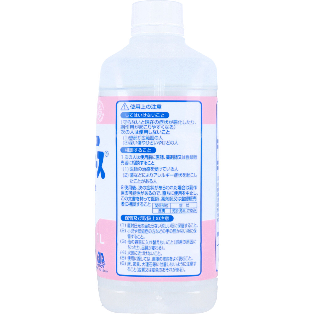 注意事項 | 【用法及び用量に関連する注意】 ・用法・用量を厳守すること。 ・本剤は希釈せず、原液のまま使用すること。 ・小児に使用させる場合には、保護者の指導監督のもとに使用させること。 ・目に入らないように注意すること。万一、目に入った場合には、すぐに水又はぬるま湯で洗うこと。なお、症状が重い場合には、眼科医の診療を受けること。 ・外用にのみ使用し、アルコールが完全に揮発するまで擦り込むこと。 ・血液や汚物等が付着している場合には、石けんで洗浄後、水分を除去してから使用すること。 【使用上の注意】 ★してはいけないこと(守らないと現在の症状が悪化したり、副作用が起こりやすくなる) ・次の人は使用しないこと。 (1)患部が広範囲の人 (2)深い傷やひどいやけどの人 ★相談すること ・次の人は使用前に医師、薬剤師又は登録販売者に相談すること。 (1)医師の治療を受けている人 (2)薬などによりアレルギー症状を起こしたことがある人 ・使用後、次の症状があらわれた場合は副作用の可能性があるので、直ちに使用を中止し、この文書を持って医師、薬剤師又は登録販売者に相談すること。 関係部位:皮膚/症状:発疹、発赤、かゆみ ★保管及び取扱上の注意 ・直射日光の当たらない涼しい所に保管すること。 ・小児や認知症の方などの手の届かない所に保管すること。 ・他の容器に入れ替えないこと(誤用の原因になったり、品質が変わる)。 ・火気に近づけないこと。 ・使用に際しては、直接の被包をよく読むこと。 ・床、家具、大理石等に付着しないようにすること(変質又は変色のおそれがある)。 |