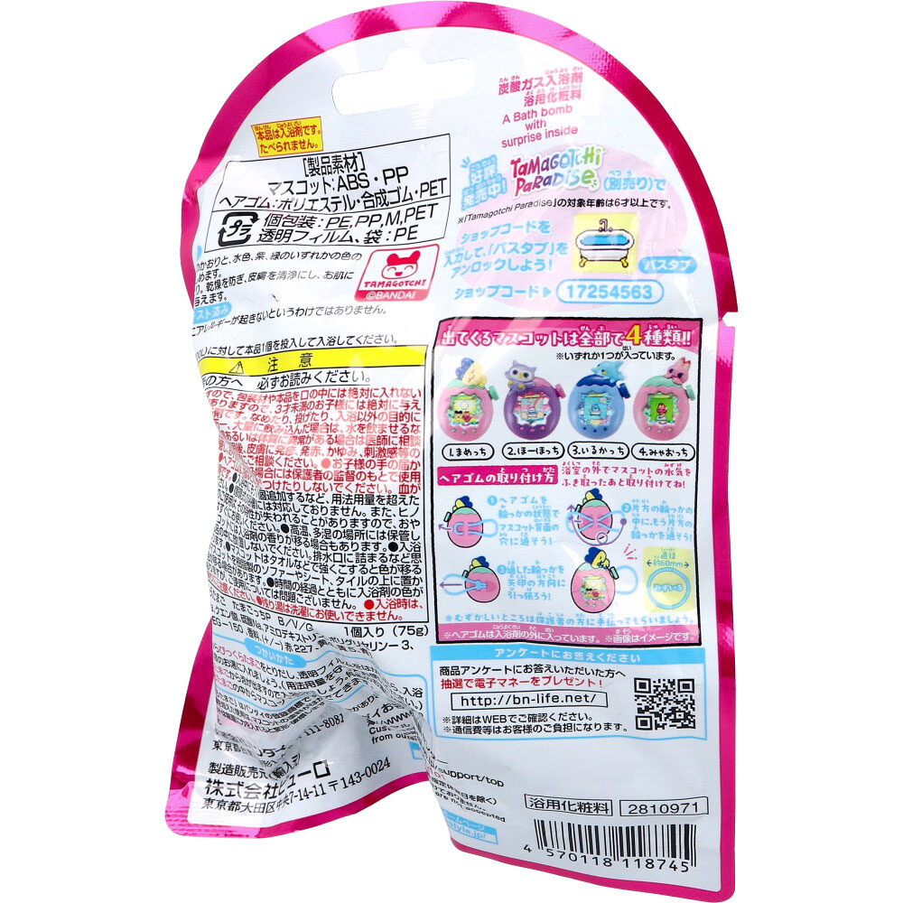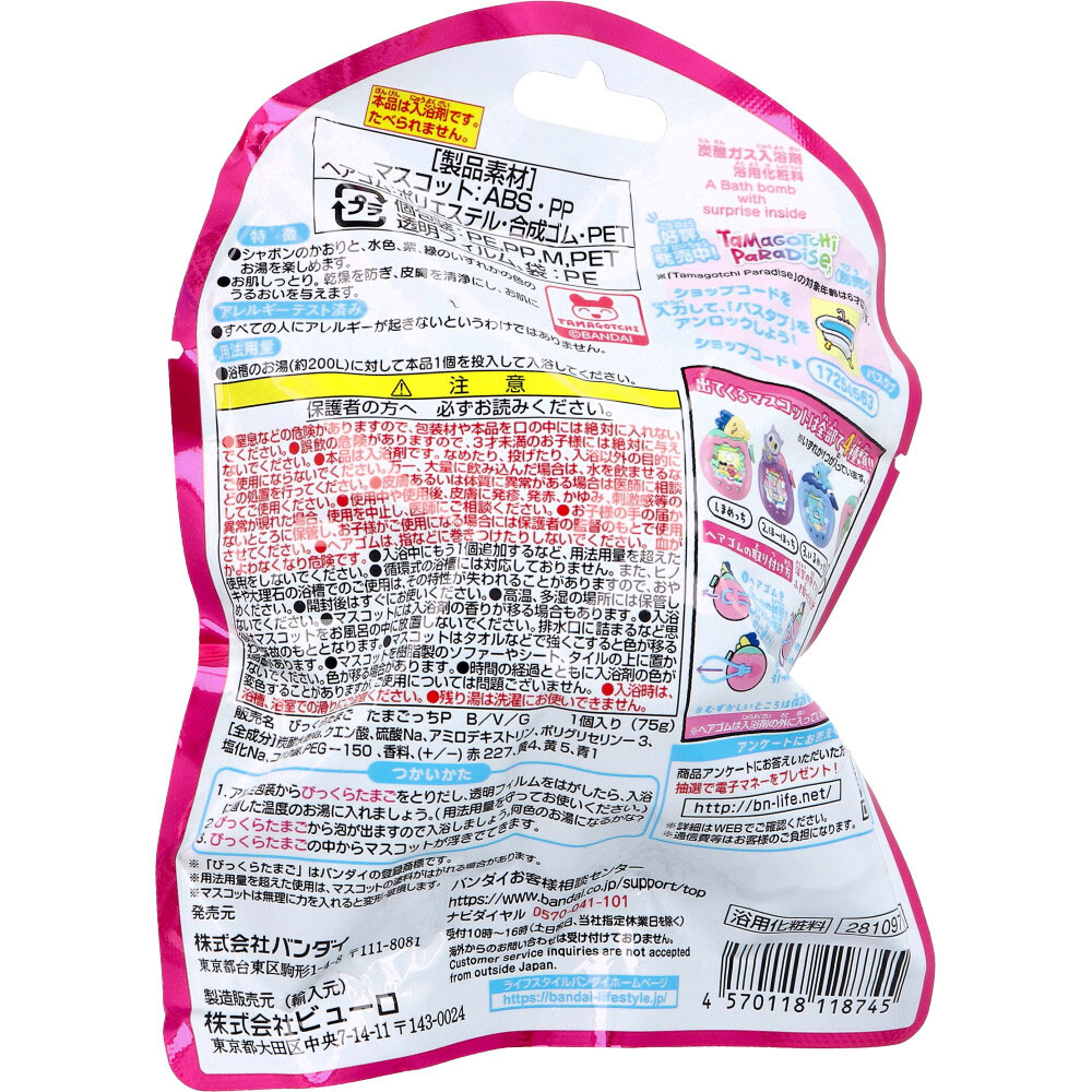 素材 | 【浴用化粧料】 販売名:びっくらたまご たまごっちP B/V/G 【製品素材】 マスコット:ABS、PP ヘアゴム:ポリエステル、合成ゴム、PET 【全成分】 炭酸水素Na、クエン酸、硫酸Na、アミロデキストリン、ポリグリセリン-3、塩化Na、コハク酸、PEG-150、香料、(+/-)赤227、黄4、黄5、青1 【用法用量】 ・浴槽のお湯(約200L)に対して本品1個を投入して入浴してください。 【つかいかた】 (1)アルミ包装からびっくらたまごをとりだし、透明フィルムをはがしたら、入浴に適した温度のお湯に入れましょう。(用法用量を守ってお使いください。) (2)びっくらたまごから泡が出ますので入浴しましょう。 (3)びっくらたまごの中からマスコットが浮きでてきます。 ※用法容量を超えた使用は、マスコットの塗料がはがれる場合があります。 ※マスコットは無理に力を入れると変形・破損します。 ★ヘアゴムの取り付け方 ・浴室の外でマスコットの水気をふき取ったあと取り付けてね! (1)ヘアゴムを輪っかの状態でマスコット背面の穴に通そう! (2)片方の輪っかの中にもう片方の輪っかを通そう! (3)通した輪っかを引っ張ろう! ※むずかしいところは保護者の方に手伝ってもらいましょう。 |