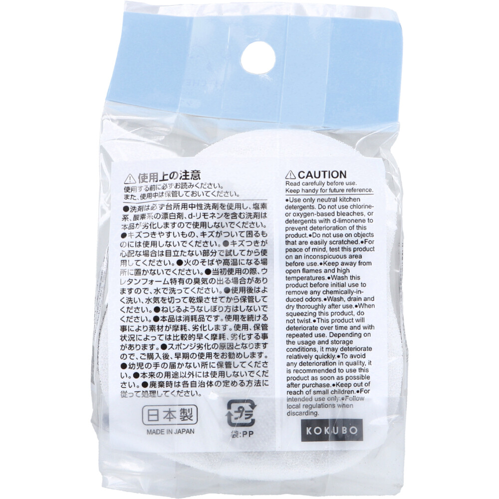 | 注意事項 | 【使用上の注意】 ・洗剤は必ず台所用中性洗剤を使用し、塩素系、酸素系の漂白剤、d-リモネンを含む洗剤は本品が劣化しますので使用しないでください。 ・キズつきやすいもの、キズついて困るものには使用しないでください。 ・キズつきが心配な場合は目立たない部分で試してから使用してください。 ・火のそばや高温になる場所に置かないでください。 ・当初使用の際、ウレタンフォーム特有の臭気が出る場合がありますので、水で洗ってください。 ・使用後はよく洗い、水気を切って乾燥させてから保管してください。 ・ねじるようなしぼり方はしないでください。 ・本品は消耗品です。使用を続けることにより素材が摩耗、劣化します。使用、保管状況によっては比較的早く摩耗、劣化する事があります。 ・スポンジ劣化の原因となりますので、購入後、早期の使用をお勧めします。 ・幼児の手の届かないところに保管してください。 ・本来の用途以外には使用しないでください。 ・廃棄時は各自治体の定める方法に従って処理してください。 |