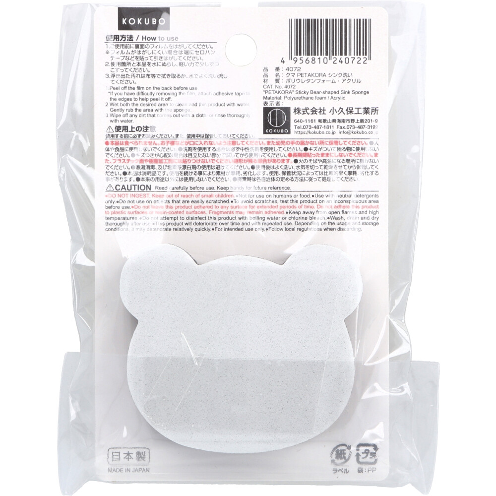 | 素材 | 【品番】 4072 【材質】 ポリウレタンフォーム・アクリル 【サイズ】 約64X73X27mm 【使用方法】 1.ご使用前に裏面のフィルムをはがしてください。 ※フィルムがはがしにくい場合は端にセロハンテープなどを貼って引きはがしてください。 2.使用箇所と本品を水にぬらし、軽い力で少しずつこすってください。 3.浮き出た汚れは布などで拭き取るか、水でよく洗い流してください。 |