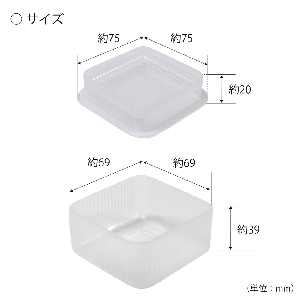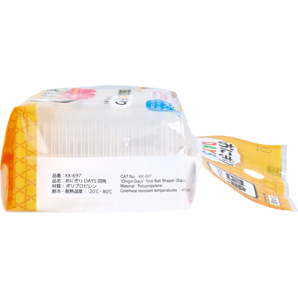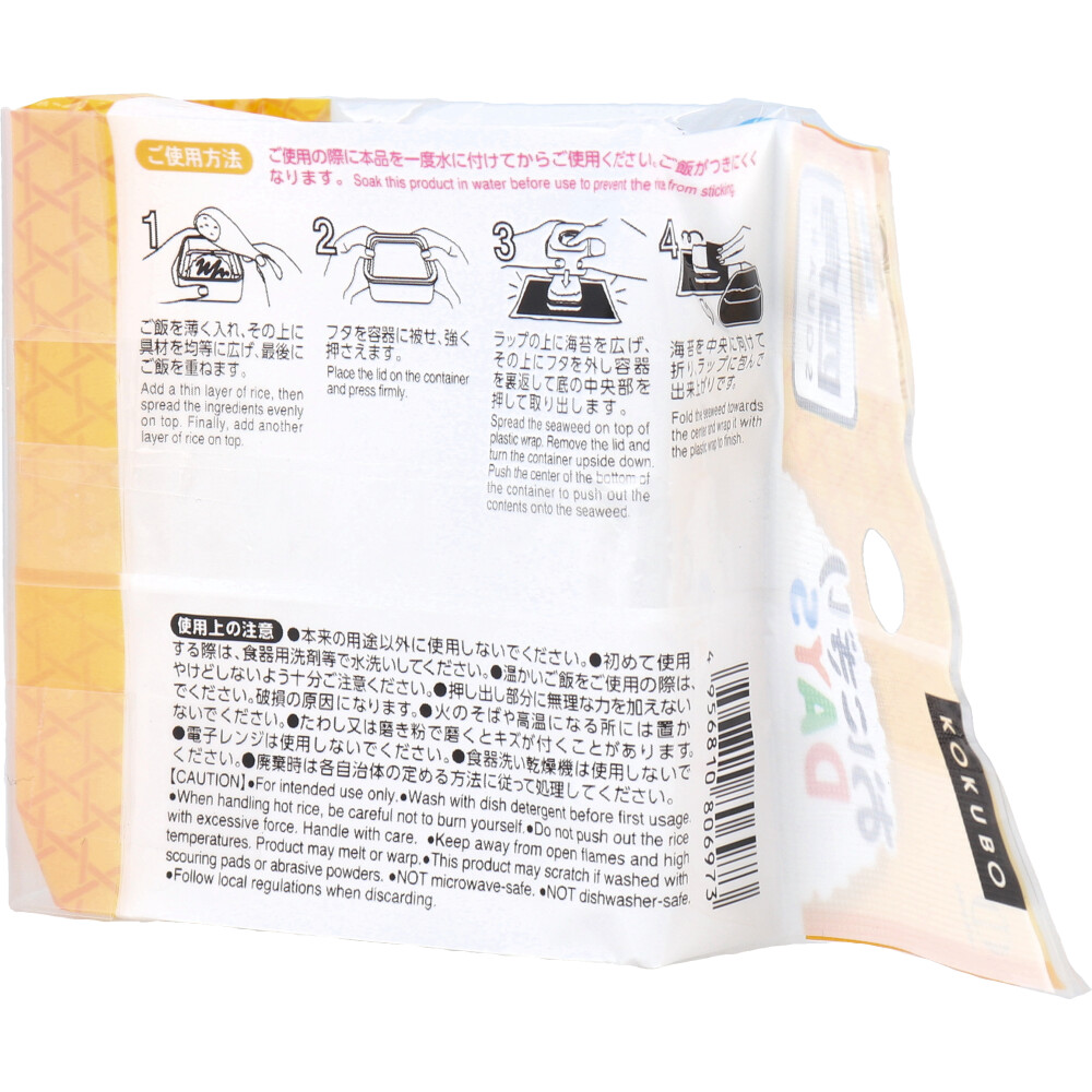 | 素材 | 【品番】 KK-697 【材質】 ポリプロピレン 【耐冷・耐熱温度】 -20度・80度 【ご使用方法】 ご使用の際に本品を一度水に付けてからご使用ください。ご飯がつきにくくなります。 1.ご飯を薄く入れ、その上に具材を均等に広げ、最後にご飯を重ねます。 2.フタを容器に被せ、強く押さえます。 3.ラップの上に海苔を広げ、その上にフタを外し容器を裏返して底の中央部を取り出します。 4.海苔を中央に向けて折り、ラップに包んで出来上がりです。 |