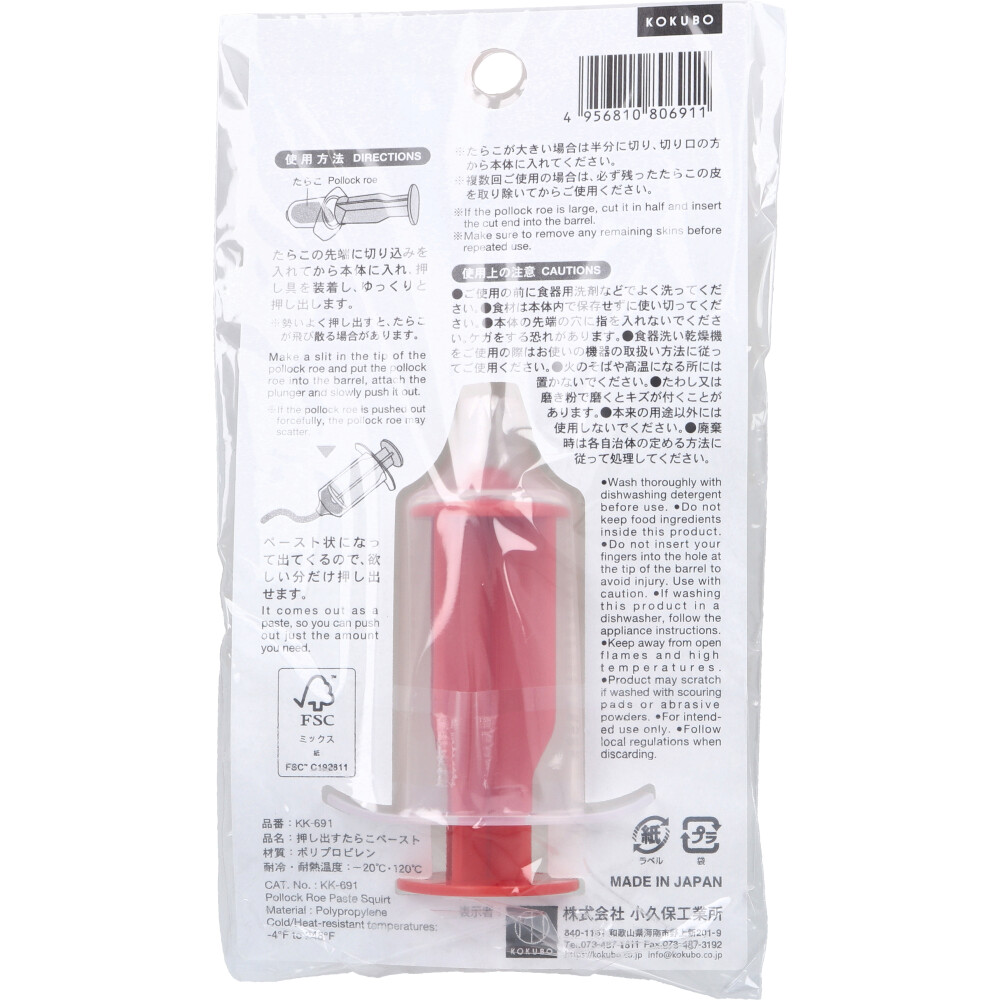 | 素材 | 【品番】 KK-691 【材質】 ポリプロピレン 【耐冷・耐熱温度】 -20度・120度 【ご使用方法】 ・たらこの先端に切り込みを入れてから本体に入れ、押し具を装着し、ゆっくりと押し出します。 ※勢いよく押し出すと、たらこが飛び散る場合があります。 ・ペースト状になって出てくるので、欲しい分だけ押し出せます。 ※たらこが大きい場合は半分に切り、切り口の方から本体に入れてください。 ※複数回ご使用の場合は、必ず残ったたらこの皮を取り除いてからご使用ください。 |