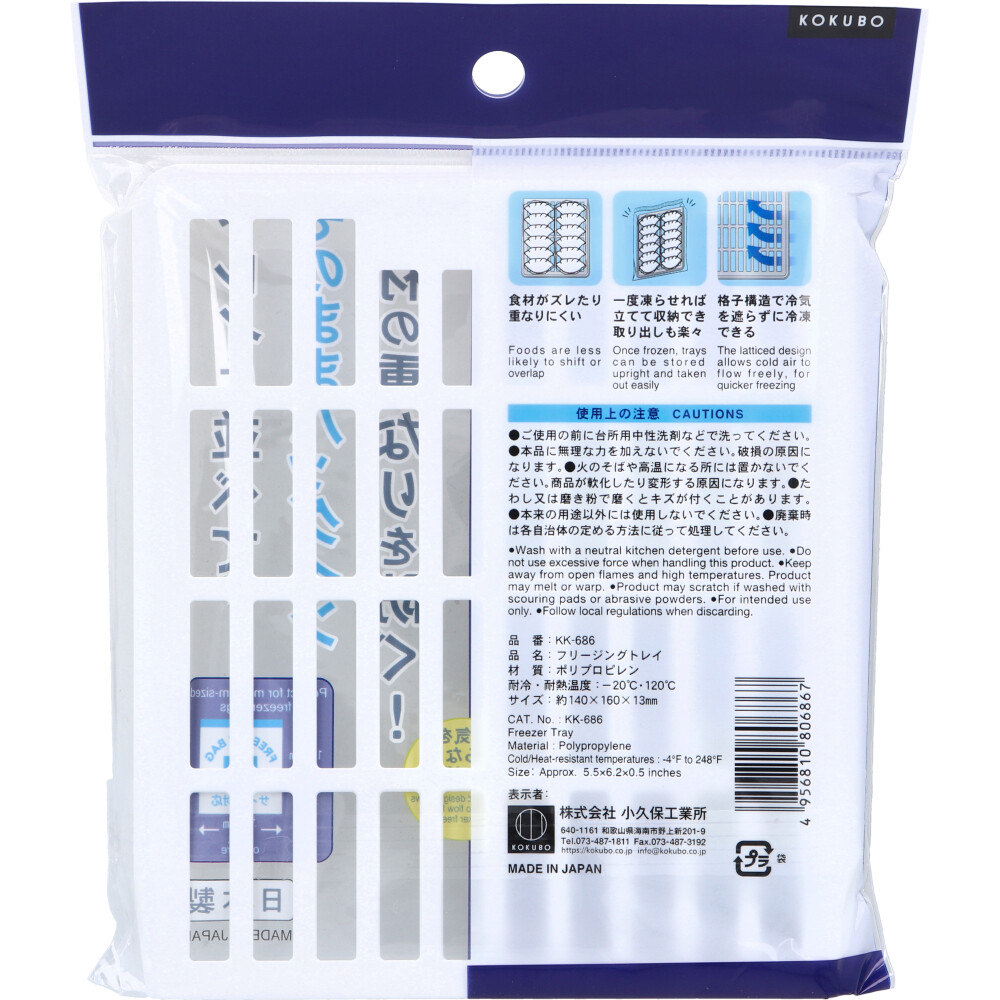 素材 | 【品番】 KK-686 【材質】 ポリプロピレン 【耐冷・耐熱温度】 -20度・120度 【サイズ】 約140X160X13mm 【使い方】 (1)冷凍したい食材をフリージングトレイに並べます。 (2)トレイごとフリーザーバッグMサイズに入れます。 (3)冷凍庫に置いて保存します。 一度凍らせれば立てて収納できます。 |