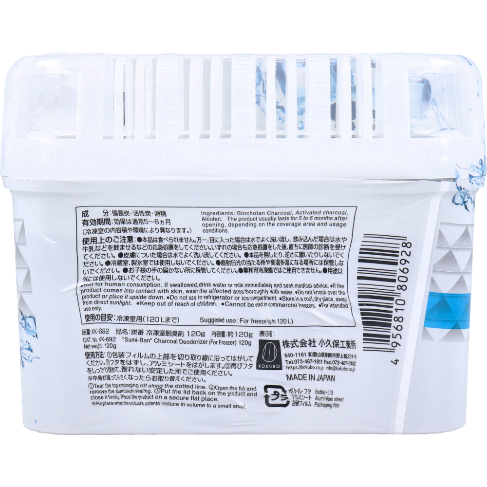 素材 | 【品番】 KK-692 【成分】 備長炭、活性炭、酒精 【使用の目安】 冷凍室用(120Lまで) 【有効期間】 効果は通常5~6カ月(冷凍室の内容積や環境により異なります。) 【サイズ】 約高さ92×横122×奥行35mm 【使用方法】 (1)包装フィルムの上部を切り取り線に沿ってはがしてください。 (2)フタをはずし、アルミシートをはがします。 (3)再びフタをしっかり閉めて、倒れない安定した所でご使用ください。 ※中身が減って小さくなったらお取り替えください。 |