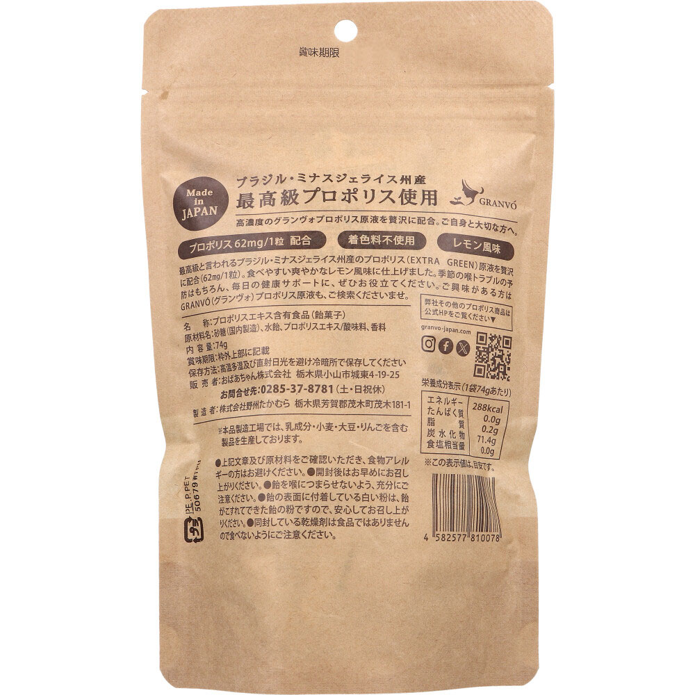 素材 | 【名称】 プロポリスエキス含有食品(飴菓子) 【原材料名】 砂糖(国内製造)、水飴、プロポリスエキス/酸味料、香料 【栄養成分表示(1袋74gあたり)】 エネルギー:288kcaL たんぱく質:0.0g 脂質:0.2g 炭水化物:71.4g 食塩相当量:0.0g 【保存方法】 ・高温多湿及び直射日光を避け冷暗所で保存してください。 |
