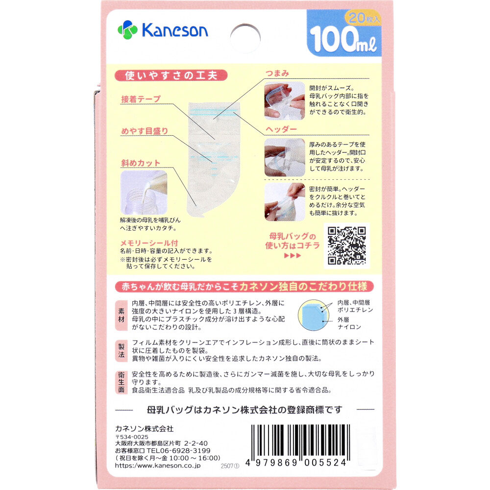 ・ヘッダー:厚みのあるテープを使使用したヘッダー。開封ロが安定するので安心して母乳が注げます。