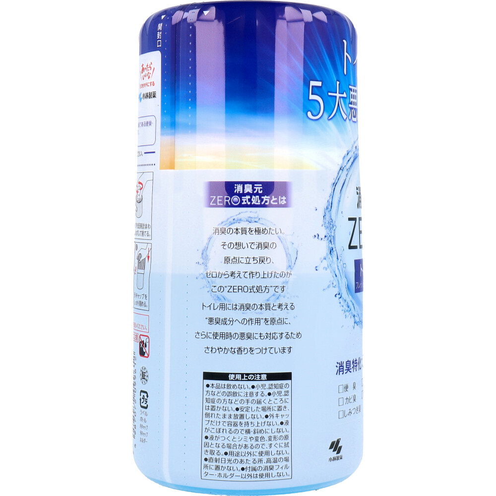 注意事項 | 【使用上の注意】 ・本品は飲めない。 ・小児、認知症の方などの誤飲に注意する。 ・小児、認知症の方などの手の届くところには置かない。 ・安定した場所に置き、倒れたまま放置しない。 ・外キャップだけで本品を持ち上げない。 ・液がこぼれるので横・斜めにしない。 ・液がつくとシミや変色、変形の原因となる場合があるので、すぐに拭き取る。 ・用途以外に使用しない。 ・直射日光のあたる所、高温の場所に置かない。 ・付属の消臭フィルター・ホルダー以外は使用しない。 ・誤飲に注意。 【応急処置】 ・液体が目に入った場合は、すぐに流水で洗い流す。 ・液が手についた場合はよく洗う。 ・飲んだ場合は、吐かせずにコップ1~2杯の水を飲ませる。 ・気分が悪くなったときは、使用を中止する。 ・異常がある場合は本品を持参し、医師に相談する。 |