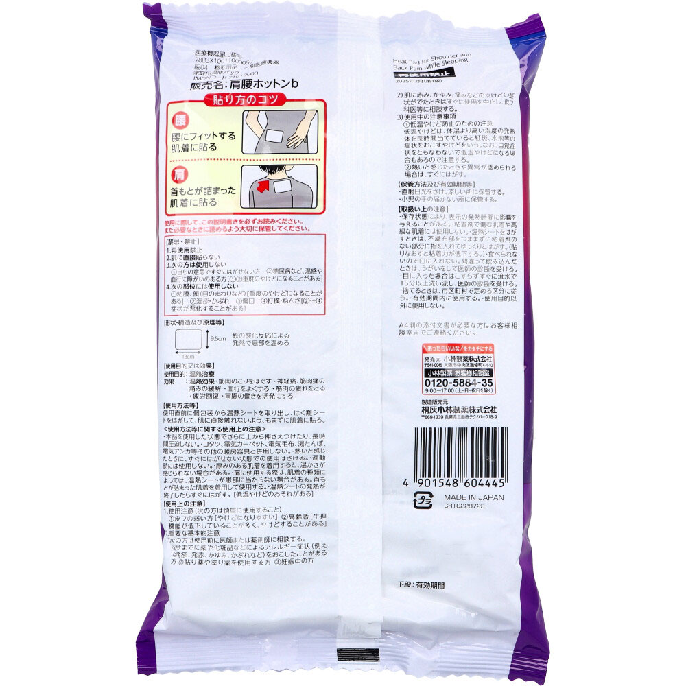 素材 | 【医療機器】 販売名:肩腰ホットンb 医療機器届出番号:28B3X10011000050 【使用目的】 温熱効果 【効果】 温熱治療 ・筋肉のこりをほぐす ・神経痛、筋肉痛の痛みの緩解 ・血行をよくする ・筋肉の疲れをとる ・疲労回復 ・胃腸の働きを活発にする 【使用方法】 ・使用直前に個包装から温熱シートを取り出し、はく離シートをはがして、肌に直接触れないよう、もまずに肌着に貼る。 ・貼り方のコツ 腰:腰にフィットする肌着に貼る 肩:首もとが詰まった肌着に貼る ★禁忌・禁止 1.再使用禁止 2.肌に直接貼らない 3.次の方は使用しない (1)自らの意思ですぐにはがせない方 (2)糖尿病など、温感や血行に障がいのある方 ((1)(2)重度のやけどになることがある) 4.次の部位には使用しない (1)粘膜、顔(目のまわりなど)(重度のやけどになることがある) (2)湿疹・かぶれ (3)傷口 (4)打撲・ねんざ ((2)~(4)症状が悪化することがある) |