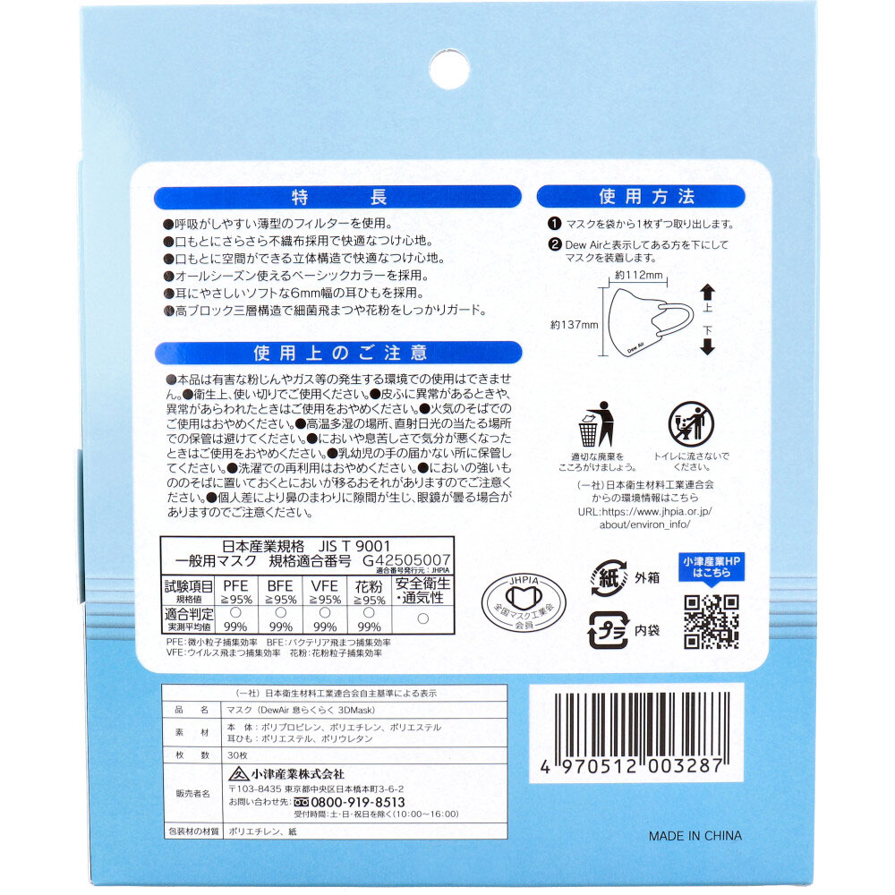 素材 | 【品名】 マスク 【サイズ】 Medium Size:約11.2cm×13.7cm 【素材】 本体:ポリプロピレン、ポリエチレン、ポリエステル 耳ひも:ポリエステル、ポリウレタン 【使用方法】 (1)マスクを袋から1枚ずつ取り出します。 (2) Dew Airと表示してある方を下にしてマスクを装着します。 |