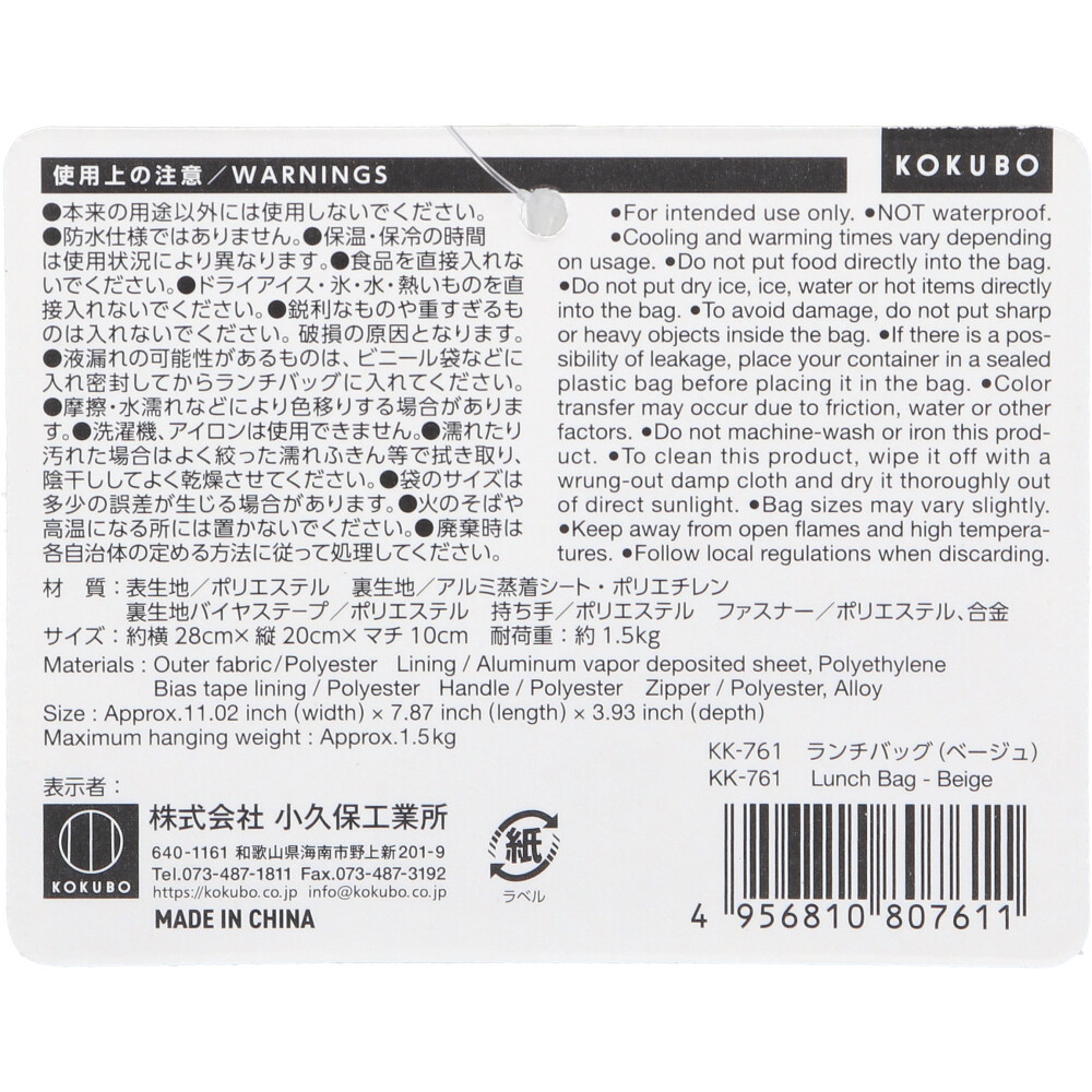 | 注意事項 | 【使用上の注意】 ・本来の用途以外には使用しないでください。 ・防水仕様ではありません。 ・保温・保冷の時間は使用状況により異なります。 ・食品を直接入れないでください。 ・ドライアイス・氷・水・熱いものを直接入れないでください。 ・鋭利なものや重すぎるものは入れないでください。破損の原因となります。 ・液漏れの可能性があるものは、ビニール袋などに入れ密封してからランチバッグに入れてください。 ・摩擦・水濡れなどにより色移りする場合があります。 ・洗濯機、アイロンは使用できません。 ・濡れたり汚れた場合はよく絞った濡れふきん等で拭き取り、陰干ししてよく乾燥させてください。 ・袋のサイズは多少の誤差が生じる場合があります。 ・火のそばや高温になる所には置かないでください。 ・廃棄時は各自治体の定める方法に従って処理してください。 |