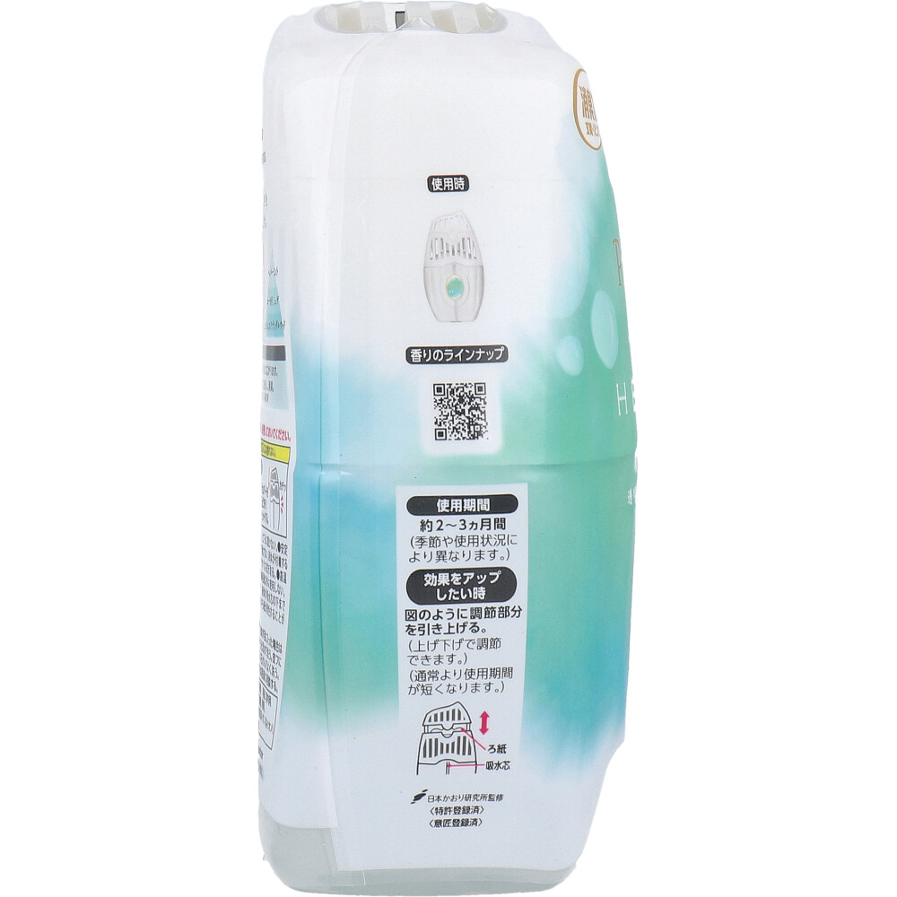 素材 | 【品名】 消臭・芳香剤 【用途】 室内用 【成分】 無機系消臭剤、香料、界面活性剤(非イオン、陰イオン) 【使用期間】 約2~3ヵ月間 (季節や使用状況により異なります。) 【使用方法】 ※外カバーの中の白い「ろ紙」、ボトル内の「吸水芯」には触れない。 (1)外カバーをひねり上げてはずす。 (2)内キャップのみ捨てる。 (3)外カバーを元どおりセットする。 ★効果をアップしたい時:調節部分を引き上げる。 (上げ下げで調節できます。) (通常より使用期間が短くなります。) 【応急処置】 ・液体が目に入った場合は充分流水で洗う。 ・皮フについた場合は石けんでよく洗う。 ・異常のある時は医師に相談する。 |