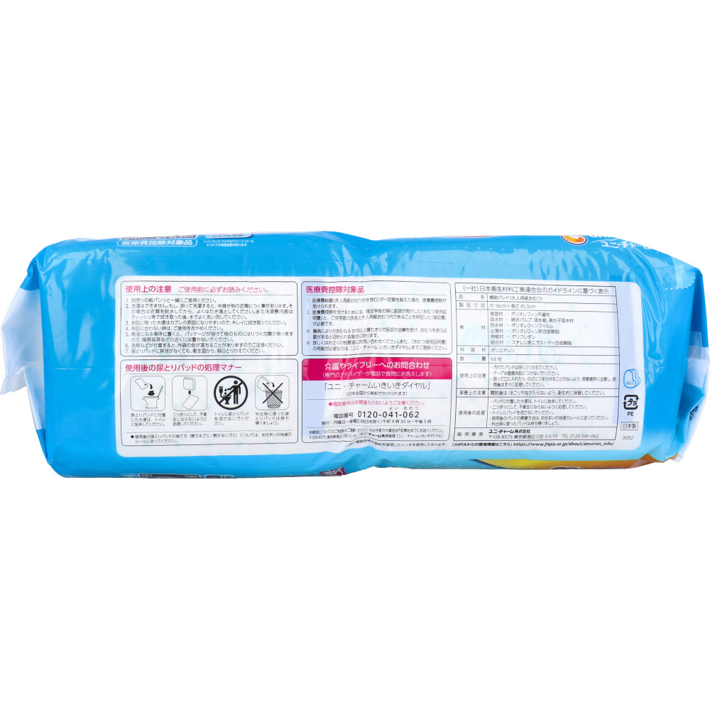 | 注意事項 | 【使用上の注意】 ・汚れたパッドは早くとりかえてください。 ・テープは直接お肌につけないでください。 ・誤って口にいれたり、のどにつまらせることのないよう、保管場所に注意し、使用後はすぐに処理してください。 ★保管上の注意 ・開封後は、ほこりや虫が入らないよう、衛生的に保管してください。 ★使用後の処理 ・パッドに付着した大便は、トイレに始末してください。 ・二つ折りにして、不衛生にならにように処理してください。 ・トイレにパッドを流さないでください。 ・使用後のパッドの廃棄方法は、お住まいの地域のルールに従ってください。 ・外出時に使ったパッドは持ち帰りましょう。 |