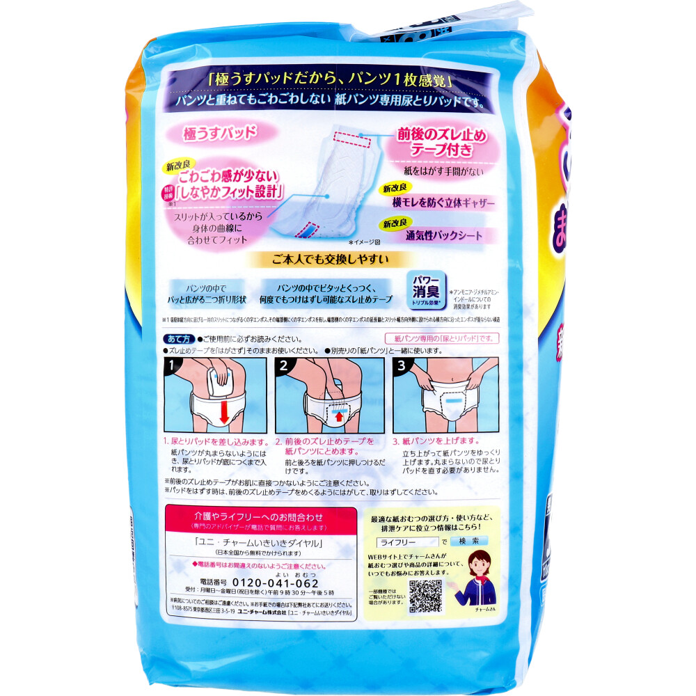 パンツと重ねてもごわごわしない紙パンツ専用尿とりパッドです。