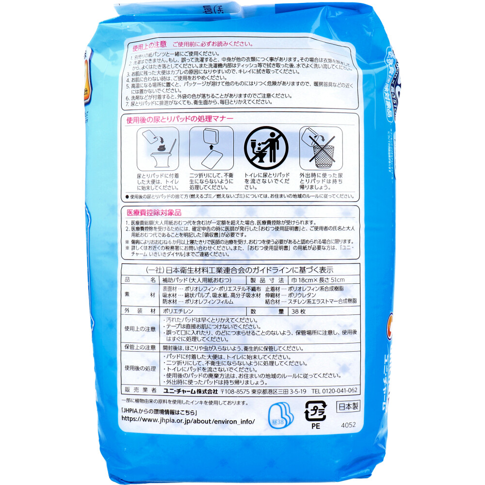 | サイズ | 個装サイズ:370X260X170mm 個装重量:約1770g 内容量:38枚入 ケースサイズ:55X25X38.5cm ケース重量:約6.3kg 製造国:日本 【ケース入数:3】【販売業者:ユニ・チャーム株式会社】 |
