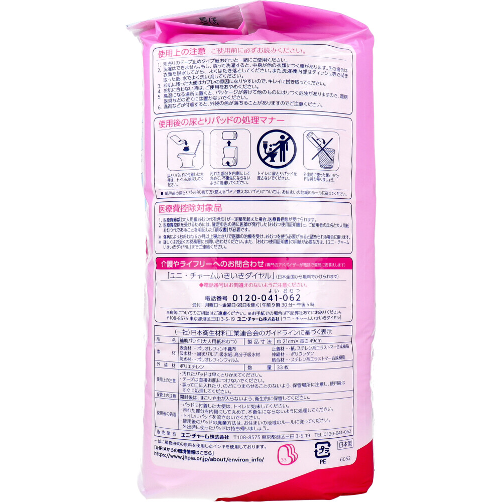 | 素材 | 【医療費控除対象品】 補助パッド(大人用紙おむつ) 【吸収回数の目安】 排尿3回分(1回の排尿量150mLとして) 【寸法】 巾21cm×長さ49cm 【素材】 表面材:ポリオレフィン不織布 吸水材:綿状パルプ、吸水紙、高分子吸水材 防水材:ポリオレフィンフィルム 止着材:紙、スチレン系エラストマー合成樹脂 伸縮材:ポリウレタン 結合材:スチレン系エラストマー合成樹脂 【あて方】 ・別売りの「テープ止めタイプ紙おむつ」と一緒に使います。テープ止めタイプ紙おむつ専用の「尿とりパッド」です。 (1)おむつの中心が背骨にくるように敷き、おむつのギャザーの内側に収まるように尿とりパッドを重ねます。 (2)体を仰向けにし、尿とりパッドを体にフィットさせながら引き上げて、尿とりパッドの前方を広げます。 (3)赤色のズレ止めテープをはがします。 (4)おむつを体の中心に合わせ、足ぐりに隙間ができないようにおむつを引き上げます。 (5)下のテープは水平もしくは上向きに、上のテープは下向きにとめます。 |