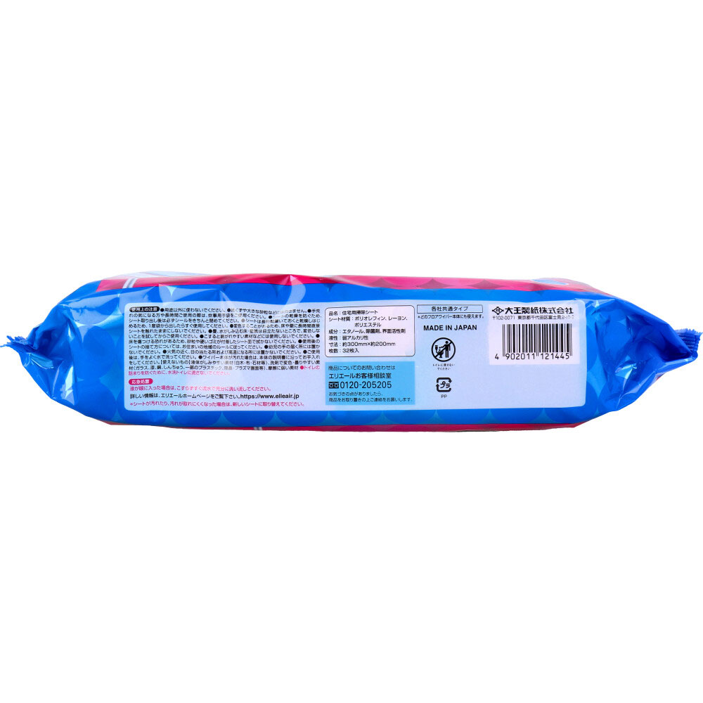 | 素材 | 【品名】 住宅用掃除シート 【シート材質】 ポリオレフィン、レーヨン、ポリエステル 【成分】 エタノール、除菌剤、界面活性剤 【液性】 弱アルカリ性 【寸法】 約300mm×約200mm 【セット方法】 ★キレキラワイパー本体の場合 ・本体の柄がゆるんでいないことを確認してください。 ・シートの中心に本体を置いて、ヘッドを包み込むようにして、4ヶ所のツメ部(差し込み口)に押し込んで止めてください。 ※シートに「こちらはドライ面です」と記載されている面がドライ面になります。 【使えないもの】 液体がしみやすい素材(白木・布・石材等)、洗剤で変色・曇りやすい素材(ガラス、漆、銅、しんちゅう、一部のプラスチック、液晶・プラズマ画面等)、摩務に弱い素材。 【応急処置】 ・液が眼に入った場合は、こすらずすぐ流水で充分に洗い流してください。 |