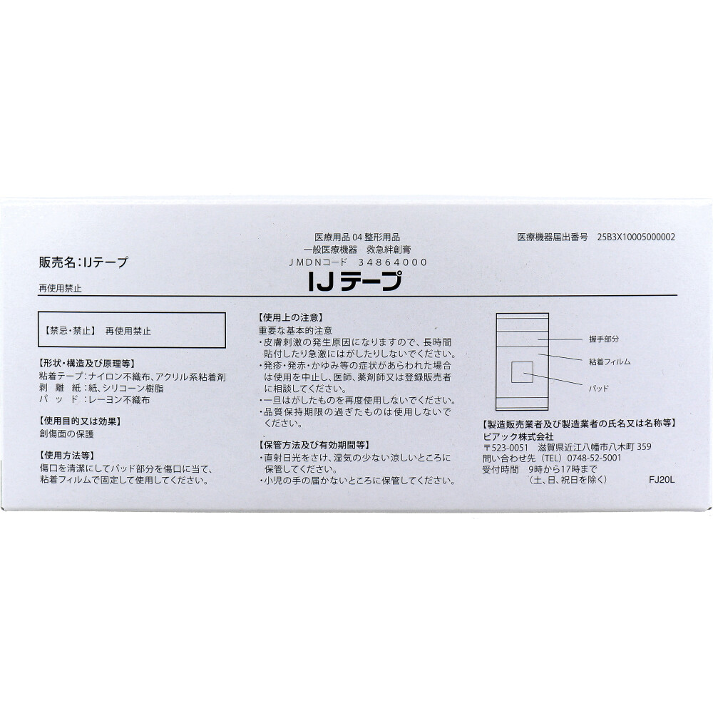 | 素材 | 【一般医療機器】 救急絆創膏 医療機器届出番号:25B3X10005000002 販売名:IJテープ 【寸法】 ・粘着フィルム:20×20mm ・パッド:8×8mm 【材質】 ・粘着テープ:ナイロン不織布、アクリル系粘着剤 ・剥離紙:紙、シリコーン樹脂 ・パッド:レーヨン不織布 【使用目的又は効果】 創傷面の保護 【使用方法等】 傷口を清潔にしてパッド部分を傷口に当て、粘着フィルムで固定して使用してください。 【保存方法】 ・直射日光をさけ、湿気の少ない涼しいところに保管してください。 ・小児の手の届かないところに保管してください。 |