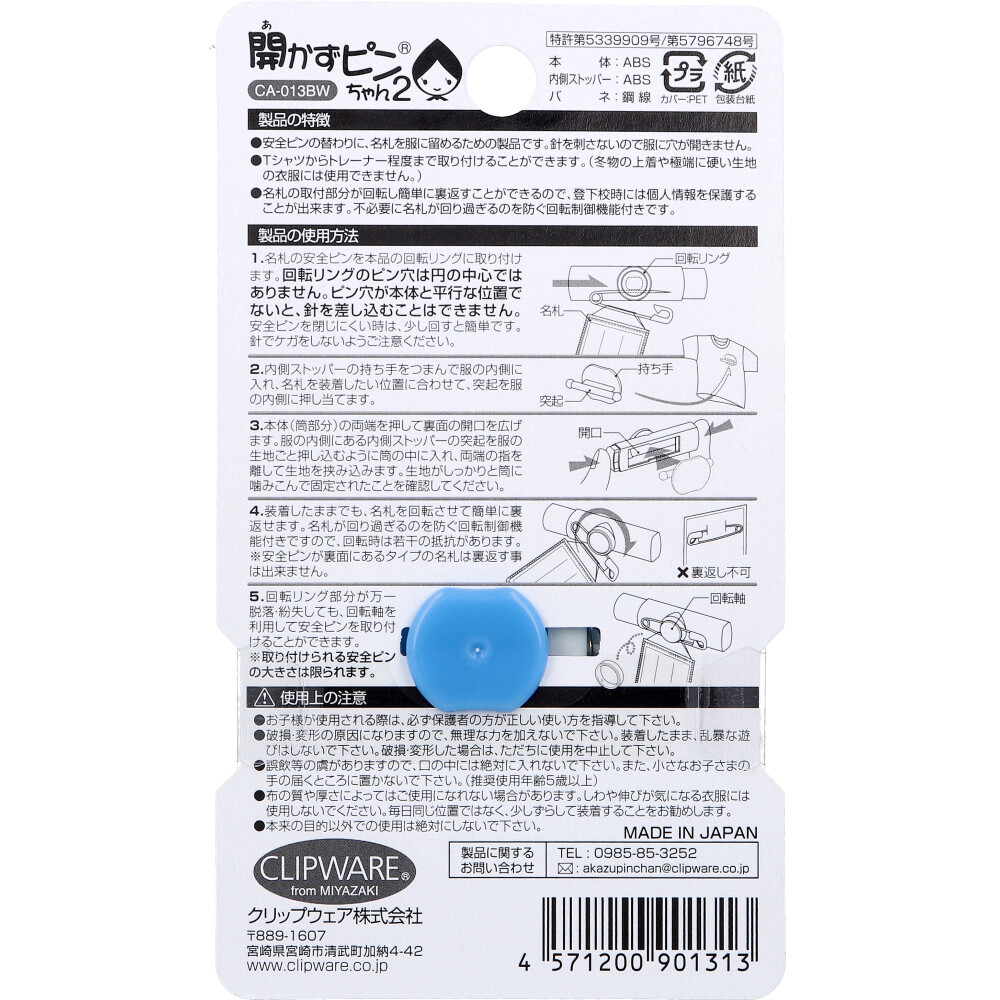 | 素材 | 【品番】 CA-013BW 【材質】 本体・内側ストッパー:ABS バネ:鋼線 【使用方法】 (1)名札の安全ピンを本品の回転リングに取り付けます。回転リングのピン穴は円の中心ではありません。ピン穴が本体と平行な位置でないと、針を差し込むことはできません。安全ピンを閉じにくい時は、少し回すと簡単です。針でケガをしないようご注意ください。 (2)内側ストッパーの持ち手をつまんで服の内側に入れ、名札を装着したい位置に合わせて、突起を服の内側に押し当てます。 (3)本体(筒部分)の両端を押して裏面の開口を広げます。服の内側にある内側ストッパーの突起を服の生地ごと押し込むように筒の中に入れ、両端の指を離して生地を挟み込みます。生地がしっかりと筒に噛みこんで固定されたことを確認してください。 (4)装着したままでも、名札を回転させて簡単に裏返せます。名札が回り過ぎるのを防ぐ回転制御機能付きですので、回転時は若干の抵抗があります。 ※安全ピンが裏面にあるタイプの名札は裏返す事は出来ません。 (5)回転リング部分が万一脱落・紛失しても回転軸を利用して安全ピンを取り付けることができます。 ※取り付けられる安全ピンの大きさは限られます。 【安全ピンの取り付け方】 ・ピン穴と本体を平行にして安全ピンを差し込みます。 ※ピン穴は円の中心より少し外側です。 ※安全ピンを取り付けていないと回転リング部分が外れる場合があります。 |