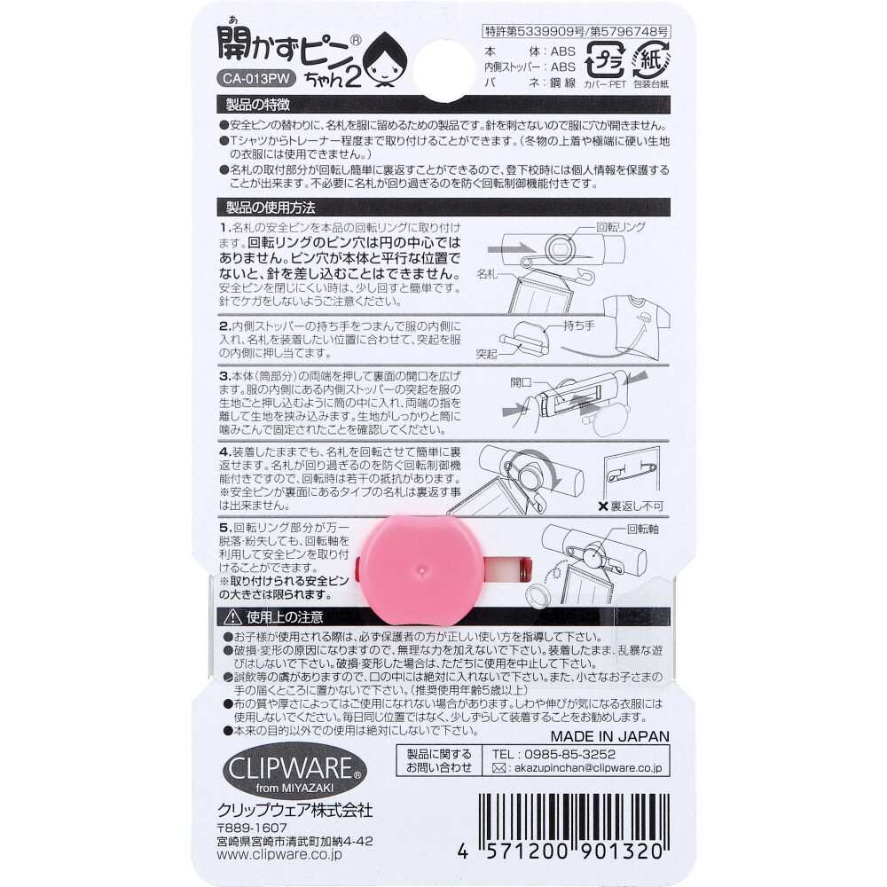 | 素材 | 【品番】 CA-013PW 【材質】 本体・内側ストッパー:ABS バネ:鋼線 【使用方法】 (1)名札の安全ピンを本品の回転リングに取り付けます。回転リングのピン穴は円の中心ではありません。ピン穴が本体と平行な位置でないと、針を差し込むことはできません。安全ピンを閉じにくい時は、少し回すと簡単です。針でケガをしないようご注意ください。 (2)内側ストッパーの持ち手をつまんで服の内側に入れ、名札を装着したい位置に合わせて、突起を服の内側に押し当てます。 (3)本体(筒部分)の両端を押して裏面の開口を広げます。服の内側にある内側ストッパーの突起を服の生地ごと押し込むように筒の中に入れ、両端の指を離して生地を挟み込みます。生地がしっかりと筒に噛みこんで固定されたことを確認してください。 (4)装着したままでも、名札を回転させて簡単に裏返せます。名札が回り過ぎるのを防ぐ回転制御機能付きですので、回転時は若干の抵抗があります。 ※安全ピンが裏面にあるタイプの名札は裏返す事は出来ません。 (5)回転リング部分が万一脱落・紛失しても回転軸を利用して安全ピンを取り付けることができます。 ※取り付けられる安全ピンの大きさは限られます。 【安全ピンの取り付け方】 ・ピン穴と本体を平行にして安全ピンを差し込みます。 ※ピン穴は円の中心より少し外側です。 ※安全ピンを取り付けていないと回転リング部分が外れる場合があります。 |