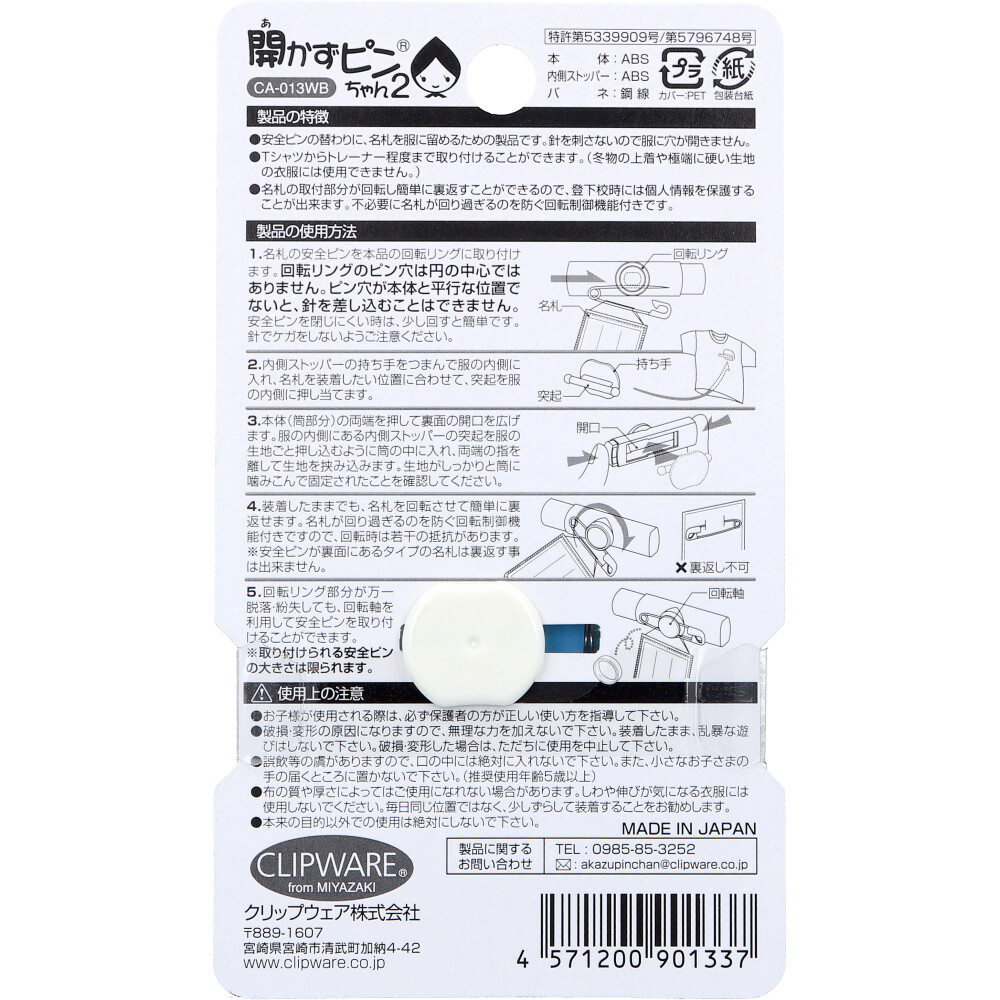 | 素材 | 【品番】 CA-013WB 【材質】 本体・内側ストッパー:ABS バネ:鋼線 【使用方法】 (1)名札の安全ピンを本品の回転リングに取り付けます。回転リングのピン穴は円の中心ではありません。ピン穴が本体と平行な位置でないと、針を差し込むことはできません。安全ピンを閉じにくい時は、少し回すと簡単です。針でケガをしないようご注意ください。 (2)内側ストッパーの持ち手をつまんで服の内側に入れ、名札を装着したい位置に合わせて、突起を服の内側に押し当てます。 (3)本体(筒部分)の両端を押して裏面の開口を広げます。服の内側にある内側ストッパーの突起を服の生地ごと押し込むように筒の中に入れ、両端の指を離して生地を挟み込みます。生地がしっかりと筒に噛みこんで固定されたことを確認してください。 (4)装着したままでも、名札を回転させて簡単に裏返せます。名札が回り過ぎるのを防ぐ回転制御機能付きですので、回転時は若干の抵抗があります。 ※安全ピンが裏面にあるタイプの名札は裏返す事は出来ません。 (5)回転リング部分が万一脱落・紛失しても回転軸を利用して安全ピンを取り付けることができます。 ※取り付けられる安全ピンの大きさは限られます。 【安全ピンの取り付け方】 ・ピン穴と本体を平行にして安全ピンを差し込みます。 ※ピン穴は円の中心より少し外側です。 ※安全ピンを取り付けていないと回転リング部分が外れる場合があります。 |