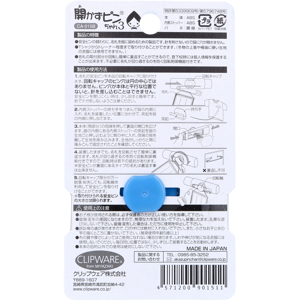 | 注意事項 | 【使用上の注意】 ・お子様が使用される際は、必ず保護者の方が正しい使い方を指導して下さい。 ・破損・変形の原因になりますので、無理な力を加えないで下さい。装着したまま、乱暴な遊びはしないで下さい。破損・変形した場合は、ただちに使用を中止して下さい。 ・誤飲等の虞がありますので、口の中には絶対に入れないで下さい。また、小さなお子さまの手の届くところに置かないで下さい。(推奨使用年齢5歳以上) ・布の質や厚さによってはご使用になれない場合があります。しわや伸びが気になる衣服には使用しないでください。毎日同じ位置ではなく、少しずらして装着することをお勧めします。 ・本来の目的以外での使用は絶対にしないで下さい。 |