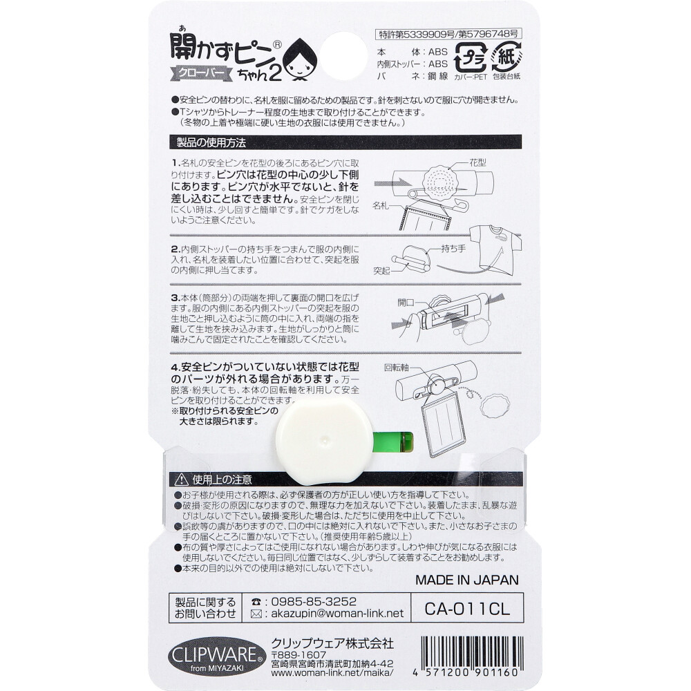 | 注意事項 | 【使用上の注意】 ・お子様が使用される際は、必ず保護者の方が正しい使い方を指導して下さい。 ・破損・変形の原因になりますので、無理な力を加えないで下さい。装着したまま、乱暴な遊びはしないで下さい。破損・変形した場合は、ただちに使用を中止して下さい。 ・誤飲等の虞がありますので、口の中には絶対に入れないで下さい。また、小さなお子さまの手の届くところに置かないで下さい。(推奨使用年齢5歳以上) ・布の質や厚さによってはご使用になれない場合があります。しわや伸びが気になる衣服には使用しないでください。毎日同じ位置ではなく、少しずらして装着することをお勧めします。 ・本来の目的以外での使用は絶対にしないで下さい。 |