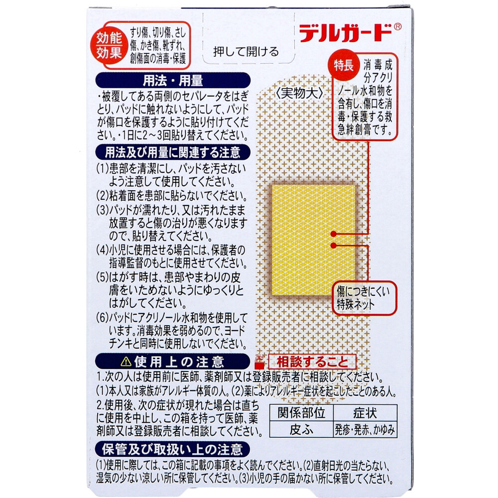 | 注意事項 | 【用法及び用量に関連する注意】 ・患部を清潔にし、パッドを汚さないよう注意して使用してください。 ・粘着面を患部に貼らないでください。 ・パッドが濡れたり、又は汚れたまま放置すると傷の治りが悪くなりますので、貼り替えてください。 ・小児に使用させる場合には、保護者の指導監督のもとに使用させてください。 ・はがす時は、患部やまわりの皮膚をいためないようにゆっくりとはがしてください。 ・パッドにアクリノール水和物を使用しています。消毒効果を弱めるので、ヨードチンキと同時に使用しないでください。 【使用上の注意】 ・次の人は使用前に医師、薬剤師又は登録販売者に相談してください。 (1)本人又は家族がアレルギー体質の人、 (2)薬によりアレルギー症状を起こしたことのある人。 ・使用後、次の症状が現れた場合は直ちに使用を中止し、この箱を持って医師、薬剤師又は登録販売者に相談してください。 【保管及び取り扱い上の注意】 ・使用に際しては、この箱に記載の事項をよく読んでください。 ・直射日光の当たらない、湿気の少ない涼しい所に保管してください。 ・小児の手の届かない所に保管してください。 |