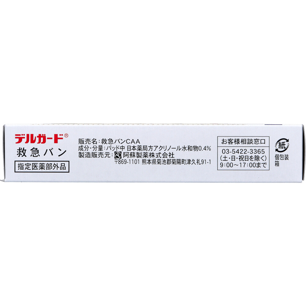 | 素材 | 【指定医薬部外品】 販売名:救急バンCAA 【成分】 パッド中 日本薬局方アクリノール水和物0.4% 【サイズ】 ・ジャンボサイズ 68mm×90mm ・パッド45mm×65mm 【効能・効果】 すり傷、切り傷、さし傷、かき傷、靴ずれ、創傷面の消毒・保護 【用法・用量】 ・被覆してある両側のセパレータをはぎとり、パッドにふれないようにして、パッドが傷口を保護するように貼り付けてください。 ・1日に2~3回貼り替えてください。 |