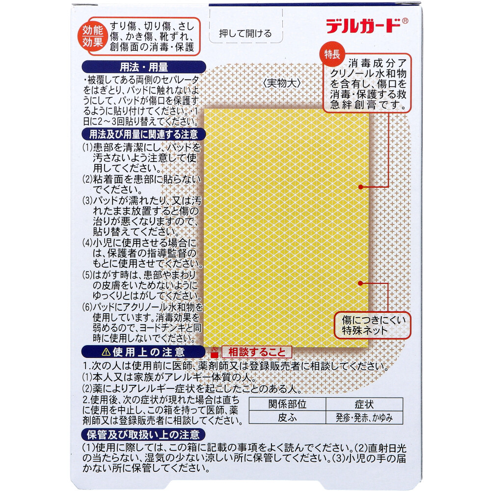 | 注意事項 | 【用法及び用量に関連する注意】 ・患部を清潔にし、パッドを汚さないよう注意して使用してください。 ・粘着面を患部に貼らないでください。 ・パッドが濡れたり、又は汚れたまま放置すると傷の治りが悪くなりますので、貼り替えてください。 ・小児に使用させる場合には、保護者の指導監督のもとに使用させてください。 ・はがす時は、患部やまわりの皮膚をいためないようにゆっくりとはがしてください。 ・パッドにアクリノール水和物を使用しています。消毒効果を弱めるので、ヨードチンキと同時に使用しないでください。 【使用上の注意】 ・次の人は使用前に医師、薬剤師又は登録販売者に相談してください。 (1)本人又は家族がアレルギー体質の人、 (2)薬によりアレルギー症状を起こしたことのある人。 ・使用後、次の症状が現れた場合は直ちに使用を中止し、この箱を持って医師、薬剤師又は登録販売者に相談してください。 【保管及び取り扱い上の注意】 ・使用に際しては、この箱に記載の事項をよく読んでください。 ・直射日光の当たらない、湿気の少ない涼しい所に保管してください。 ・小児の手の届かない所に保管してください。 |