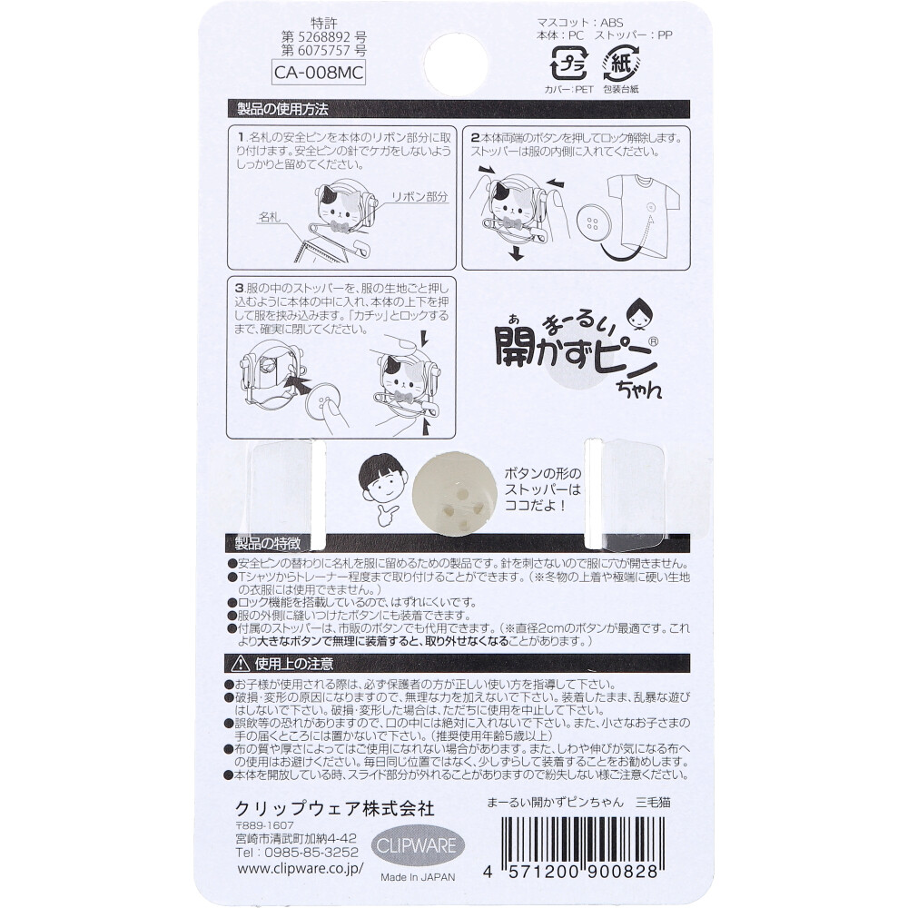 | 素材 | 【品番】 CA-008MC 【材質】 マスコット:ABS 本体:PC ストッパー:PP 【使用方法】 (1)名札の安全ピンを本体のリボン部分に取り付けます。安全ピンの針でケガをしないよう、しっかりと留めてください。 (2)本体両端のボタンを押してロック解除します。 ストッパーは服の内側に入れてください。 (3)服の中のストッパーを、服の生地ごと押し込むように本体の中に入れ、本体の上下を押して服を挟み込みます。 「カチッ」とロックするまで、確実に閉じてください。 |