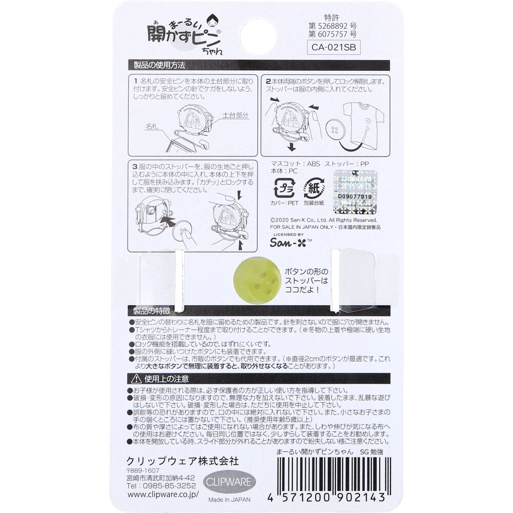 | 素材 | 【品番】 CA-021SB 【材質】 マスコット:ABS 本体:PC ストッパー:PP 【使用方法】 (1)名札の安全ピンを本体のリボン部分に取り付けます。安全ピンの針でケガをしないよう、しっかりと留めてください。 (2)本体両端のボタンを押してロック解除します。 ストッパーは服の内側に入れてください。 (3)服の中のストッパーを、服の生地ごと押し込むように本体の中に入れ、本体の上下を押して服を挟み込みます。 「カチッ」とロックするまで、確実に閉じてください。 |