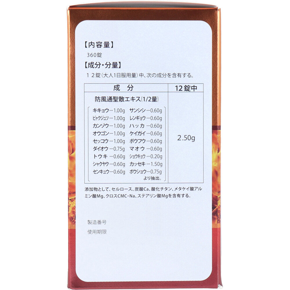 | 素材 | 【効能・効果】 体力充実して、腹部に皮下脂肪が多く、便秘がちなものの次の諸症:高血圧や肥満に伴う動悸・肩こり・のぼせ・むくみ・便秘、蓄膿症(副鼻腔炎)、湿疹・皮膚炎、ふきでもの(にきび)、肥満症 【成分・分量】 12錠(大人1日服用量)中、次の成分を含有する。 成分 防風通聖散エキス(1/2量) キキョウ:1.00g、ビャクジュツ:1.00g、カンゾウ:1.00g、オウゴン:1.00g、セッコウ:1.00g、ダイオウ:0.75g、トウキ:0.60g、シャクヤク:0.60g、センキュウ:0.60g、サンシシ:0.60g、レンギョウ:0.60g、ハッカ:0.60g、ケイガイ:0.60g、ボウフウ;0.60g、マオウ:0.60g、ショウキョウ:0.20g、カッセキ:1.50g、ボウショウ:0.75gより抽出。 分量 2.50g(12錠中) 添加物として、セルロース、炭酸Ca、酸化チタン、メタケイ酸アルミン酸Mg、クロスCMC-Na、ステアリン酸Mgを含有する。 |
